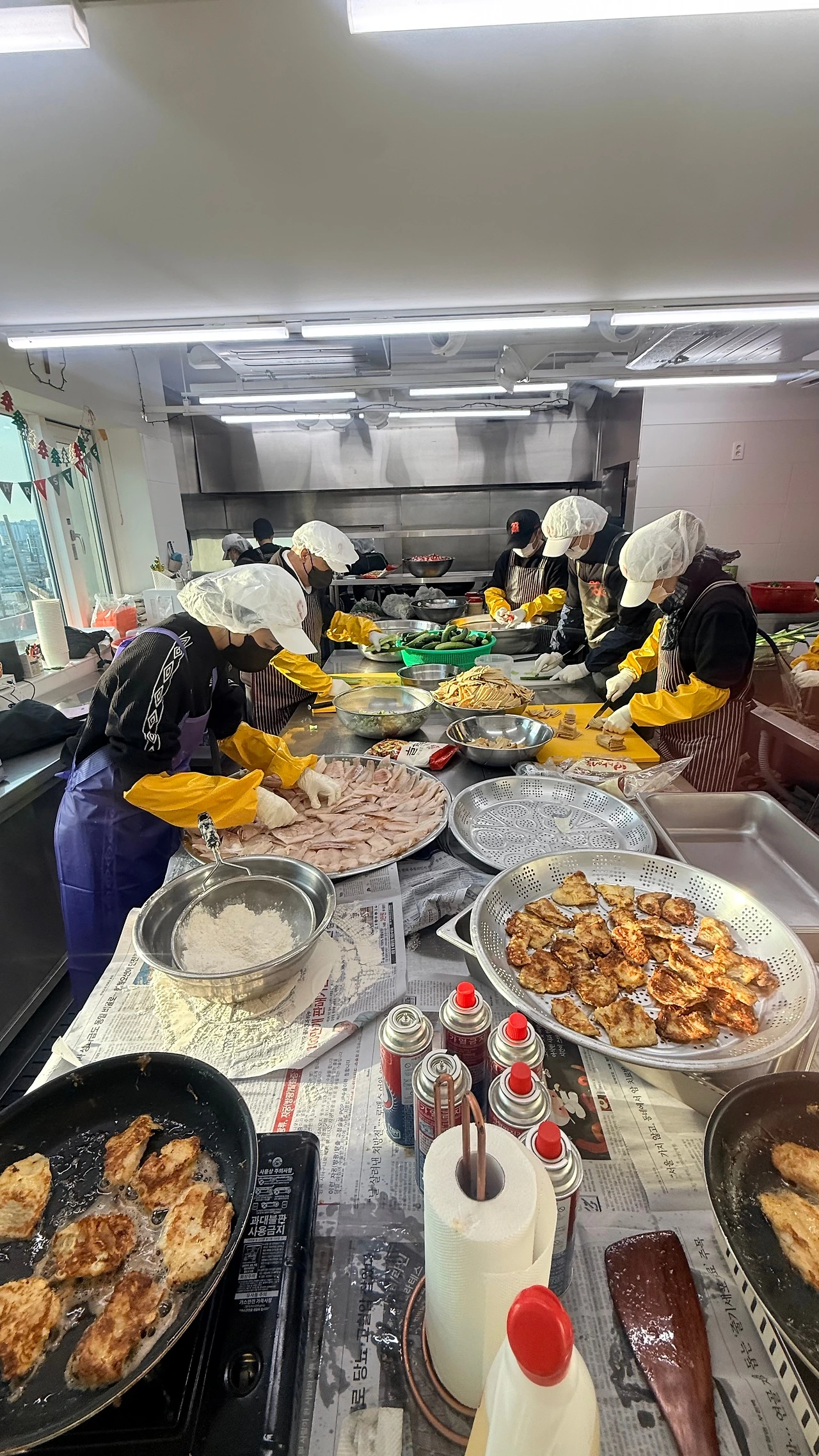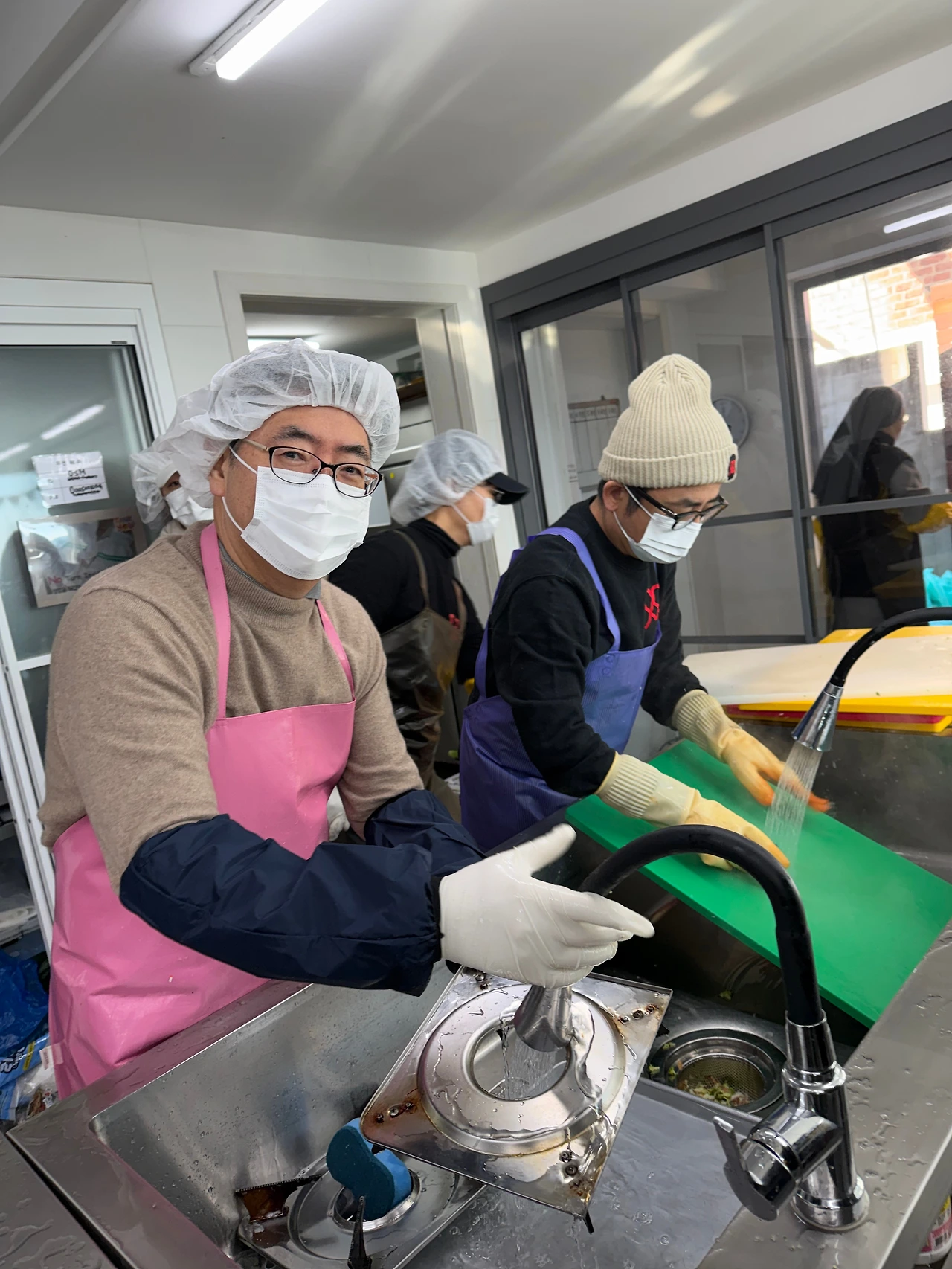 다음 날인 1월 1일 아침에 일어나 봉사활동 장소로 갔습니다. 술이 안 깨 택시를 부르고 싶었지만 한 대도 잡히지 않아 평소처럼 버스를 타고 갔습니다. 새해 첫날임에도 불구하고 많은 봉사자들이 웃으며 반찬을 만들고 있었습니다. 아내와 저는 브로콜리를 세척하는 과정에 투입되었는데 아무래도 설거지가 급한 것 같아 저는 설거지하는 곳으로 갔습니다. 오늘은 전도 부치고 떡볶이도 만들고 해서 설거지거리가 정말 많더군요. 아내 윤혜자는 술이 안 깨 고생을 하면서도 열심이었습니다. 이 봉사 다닌 지도 벌써 5년 차가 되었군요. 보령으로 이사를 간 뒤로는 참여 횟수가 줄었지만 그래도 한 달에 한두 번은 꼭 오려 노력하고 있습니다. 왜냐하면 여기 모인 사람들이 너무 선량하고 웃기고 평화로워서 같이 있으면 저까지 좋은 사람이 되는 느낌이거든요. 자원 봉사자들이기에 갈등 요소가 전혀 없고, 힘들지만 뿌듯하고, 노동 후엔 배달 가기 전 우리가 만든 음식으로 맛있게 먹는 즐거움까지 누릴 수 있으니 꿩 먹고 알 먹는 격이 아닐 수 없습니다. 오늘은 대장님의 아들과 손녀까지 와 열심히 일을 해 더욱 보기 좋았습니다.