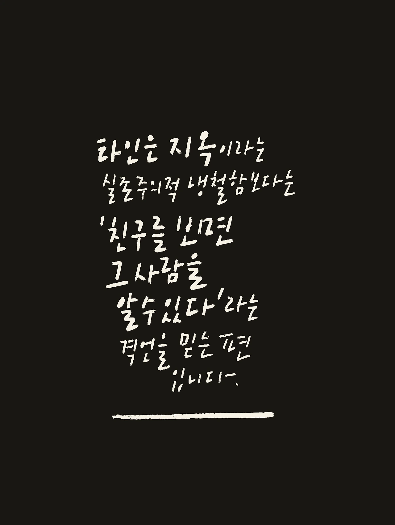 나는 '타인은 지옥'이라는 사르트르의 실존주의적 냉철함보다는 '친구를 보면 그 사람을 알 수 있다'라는 격언을 더 믿는 편이다. 앞에서도 얘기했지만 가족이 아니더라도 내 곁에 오는 사람들은 다 우연에 의해서 만난다. 그 우연이 '같은 장소를 갔던 기억'일 수도 있고 '같은 책이나 영화, 사람을 유난히 좋아하는 취향'일 수도 있다. 어떤 코드라도 좋다. 다만 나와 꼭 맞는 친구를 고르려는 욕심은 버려야 한다. 나와 같은 책을 좋아하는 사람이라도 정치적 성향이 다를 수 있고 성적 취향이 정반대일 수도 있다.