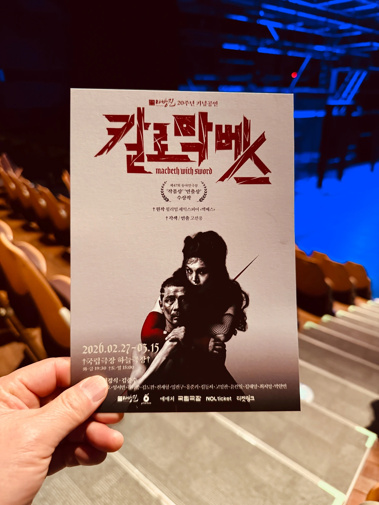 혹시 오랜만에 연극 한 편 보고 싶다는 생각이 들었다면 16년 만에 돌아온 ‘칼로막베스’를 추천할게. 연습을 많이 해서 합이 척척 맞은 무술 장면에, 마가 뜰 새 없이 주고받는 현란한 대사들에, 곳곳에 배치된 배우들의 애드리브까지...... 120분의 러닝 타임이 쏜살 같이 흘러갈 거야. 국립극장 하늘극장에서 3월 15일까지 공연하니까 기억해.