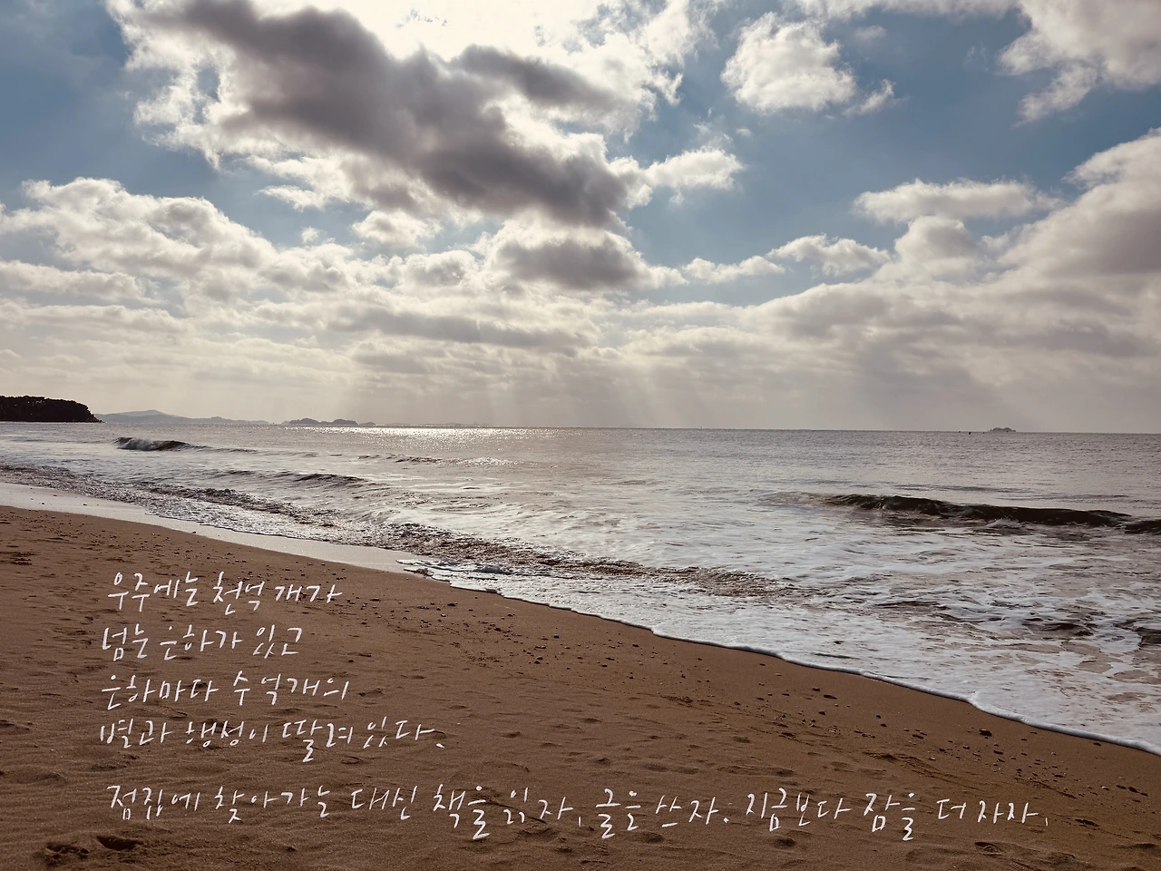 바다가 가까이 있는 보령에 살아 좋은 점은 이런 것이다. 이른 아침 자동차 시동을 걸고 20분 후면 도착하는 대천해수욕장에 가서 모래알을 밟으면서 이런 생각을 한다. 우주에서 바라보면 한낱 작은 점에 불과한 별에 살면서도 우리는 전쟁을 하고 권모술수에 현혹되고 걸핏하면 서로를 미워하는구나. 점집에 찾아가는 대신 책을 읽고 글을 쓰자. 주식 투자로 재산을 늘리는 대신 다정한 말을 주고받는 친구 한 명을 더 만들자. 너무 바쁘게 살지 말고 지금보다 잠을 한 시간 더 자자.