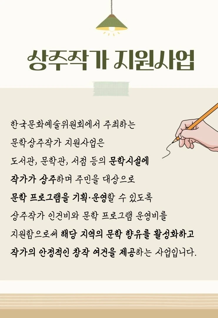문학 상주작가 지원사업은 도서관·문학관·서점 등 문학시설에 작가가 '상주'하면서 지역 주민 대상 문학 프로그램을 기획·운영할 수 있도록 인건비와 운영비를 지원하는 정부 사업이다. 윤석열정부 때 문화 관련 사업이 대폭 축소되었다가 이재명정부로 들어서며 다시 활기를 띠고 적극적으로 홍보와 지원이 이루어진 프로젝트 중 하나다.