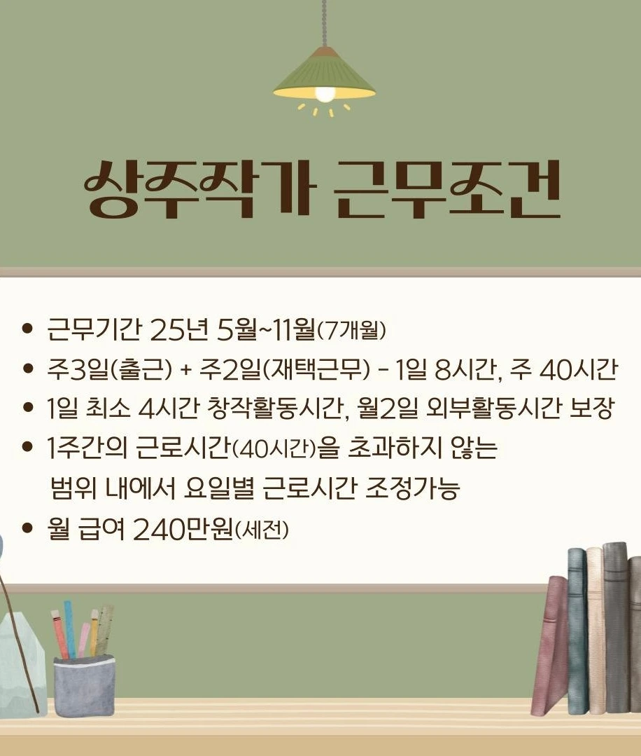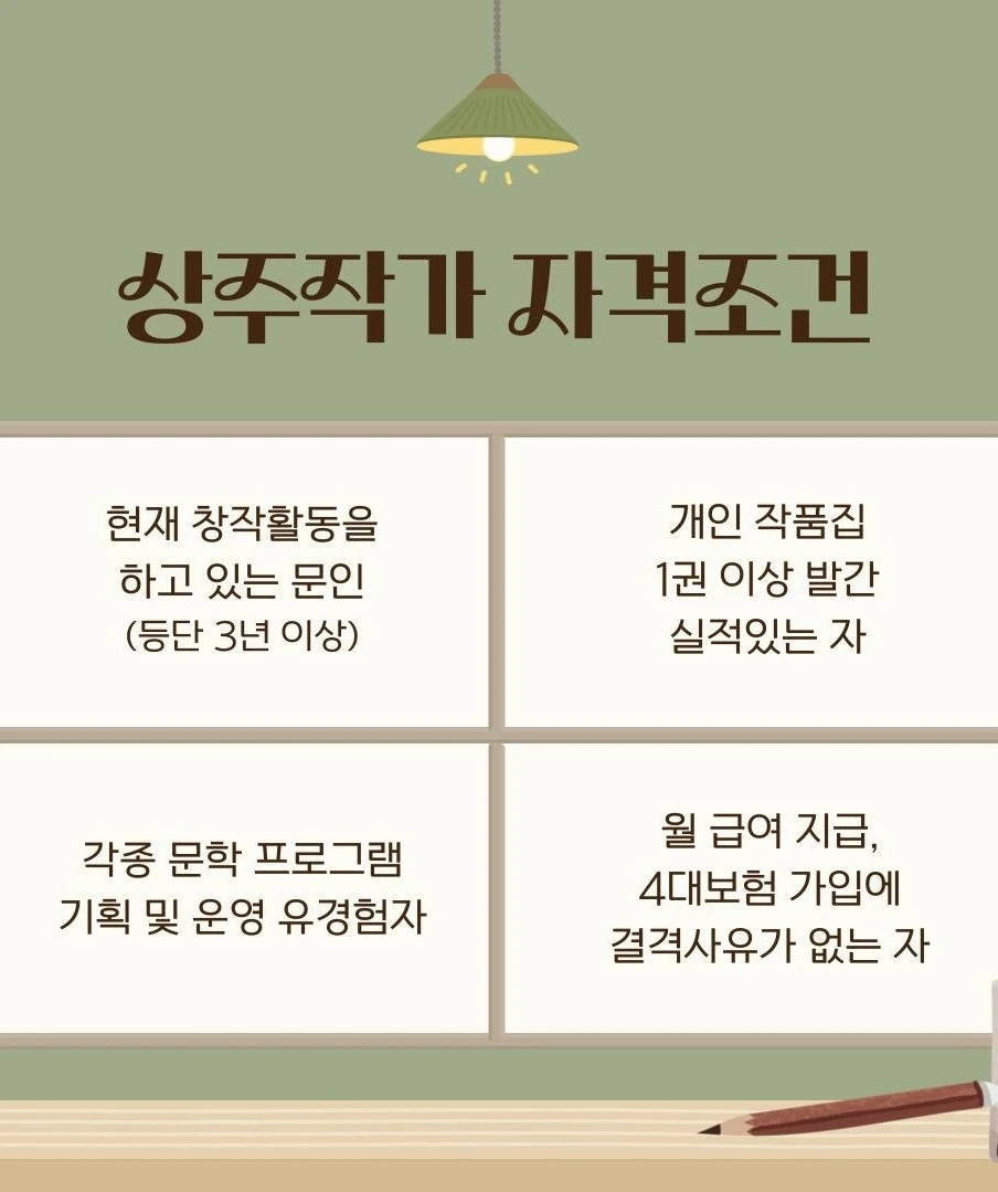 일단 상주작가가 되면 도서관이든 문학관이든 2026년 5월 2일부터 7개월 간 주 3일 출근·이틀 재택근무를 하며 월 240만 원의 급여를 받는다. 가장 좋은 건 주민 대상 문학 프로그램을 기획·운영하면서 자신의 집필실과 집필 시간도 보장받을 수 있다는 조건이다. 이렇게 되면 일정 수입이 없는 작가들은 뜨내기 강연이나 단기 모집 강연 등에 에너지를 빼앗기지 않고 좀 더 긴 호흡으로 작품을 쓸 여유를 얻는다. '상주 작가'이므로 팬들도 좌표를 찍고 작가를 만나러 오기가 쉬워진다.