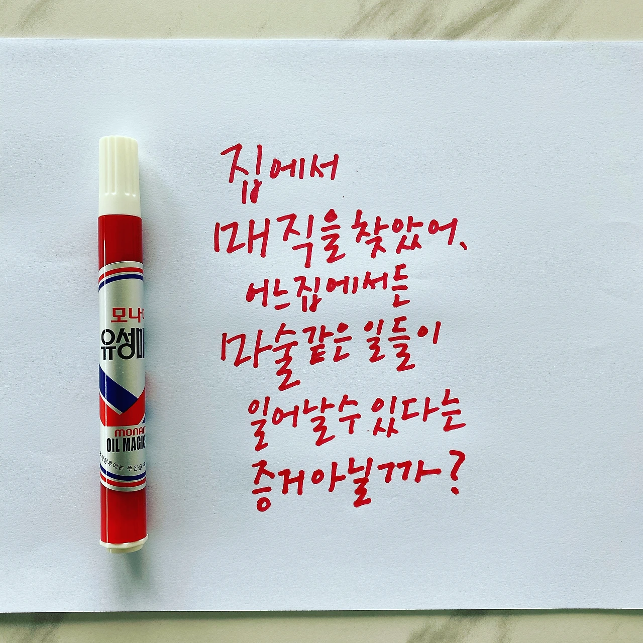 스카치테이프를 찾으려고 거실 서랍을 열었다가 매직 몇 자루를 발견했다. 어디서나 볼 수 있는 펑범한 모나미 매직펜이었다. 순간 생각했다. 매직이면 마술 아닌가. 평범한 매직펜도 생각하기에 따라 얼마든지 다른 의미가 될 수 있다. 일체유심조(一切唯心造). 이건 어느 집에서나 마술 같은 일이 일어날 수 있다는 증거다. 나와 아내에게도 마술 같은 일이 일어나길 기대한다. 나는 매직을 믿는 사람이니까.