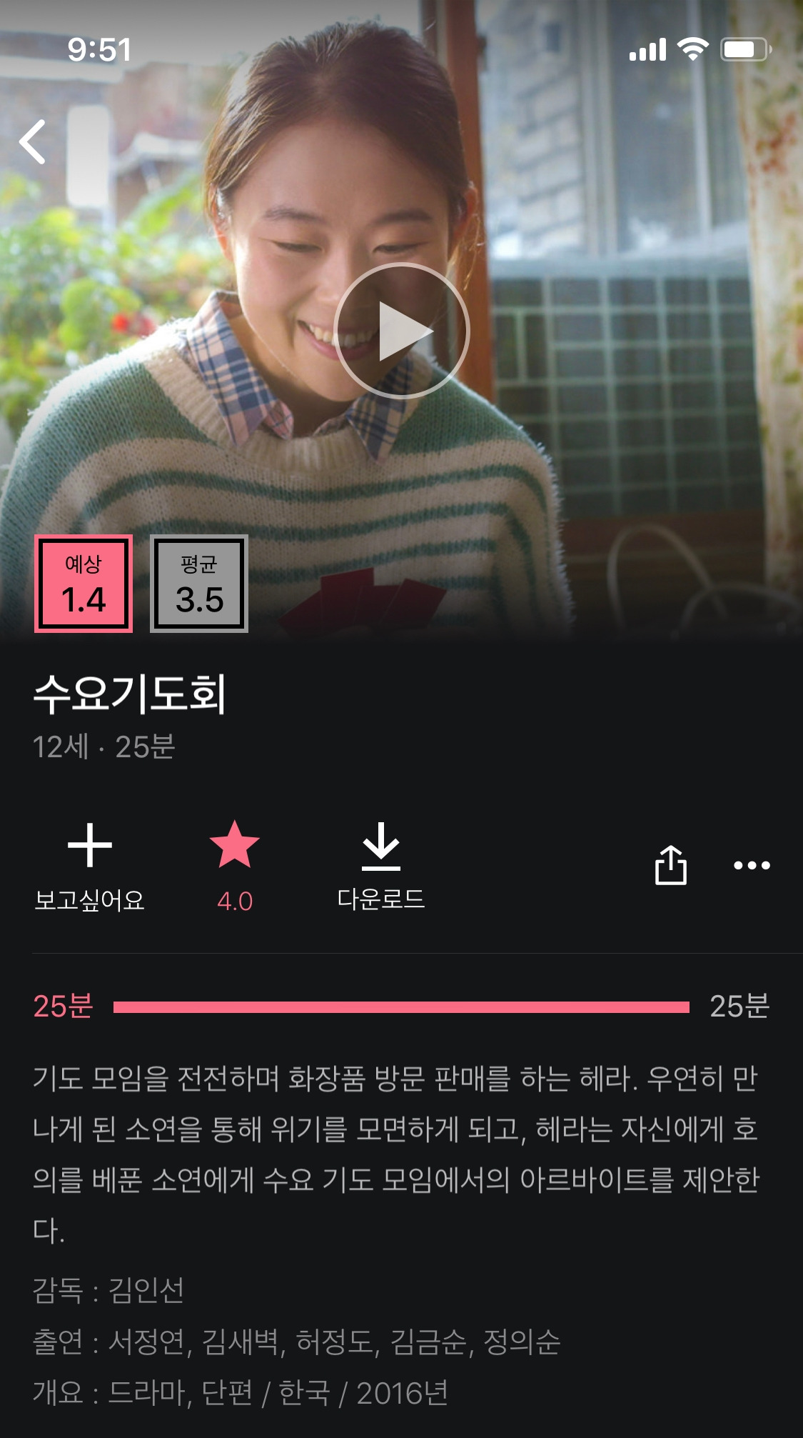 주인공은 김새벽이다. [벌새]에서 보여주던 범상치 않은 존재감은 이 영화에서도 이미 빛이 난다. 서정연, 김새벽 등 배우들의 연기가 뛰어나고 촬영도 완전 웰메이드의 냄새가 난다. 25분의 러닝 타임이 다 지나고 엔딩 크레딧을 살펴보니 제작과 배급이 ‘한국도박문제연구센터’다. 도박의 폐해를 알리는 홍보영화가 이렇게 고퀄이라니. 놀라운 일이다. 사용자 평을 읽어보니 도박 근절 공모전 출품작이었단다. 일단 몰입감이 대단하다. 유튜브에서 ‘수요기도회’를 검색하면 누구나 볼 수 있다고 하니 한 번 찾아보시기 바란다. 연기, 시나리오 모두 탄탄하다. 마지막 반전도 서늘하다.