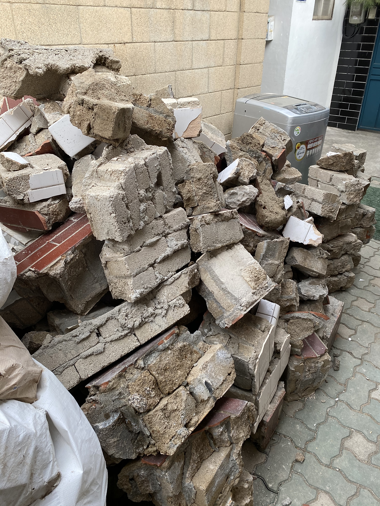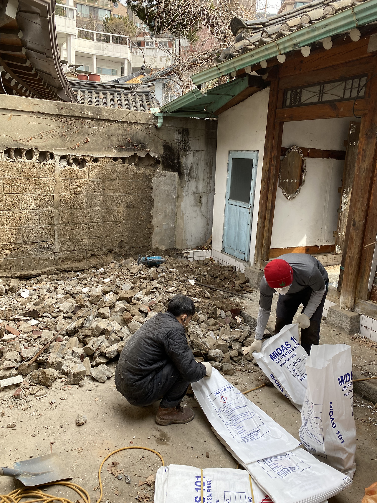 골목으로 철거 쓰레기가 가득 찼다. 지난번 성북동 소행성으로 이사 올 때도 느꼈지만 집수리의 첫 관문은 엄청난 철거 폐기물과의 전쟁이다. 이런 골목에 있는 집은 쓰레기 실어나가는 게 너무 힘든 일인데 이 집은 전 주인이 쓰던 세탁기, 싱크대, 기름통까지 철거를 해야 해서 일이 더 고되다. 다행히 임정희 목수님과 다른 기술자 분들이 모두 작은집이나 한옥 공사의 베테랑들이라 마음이 놓인다.