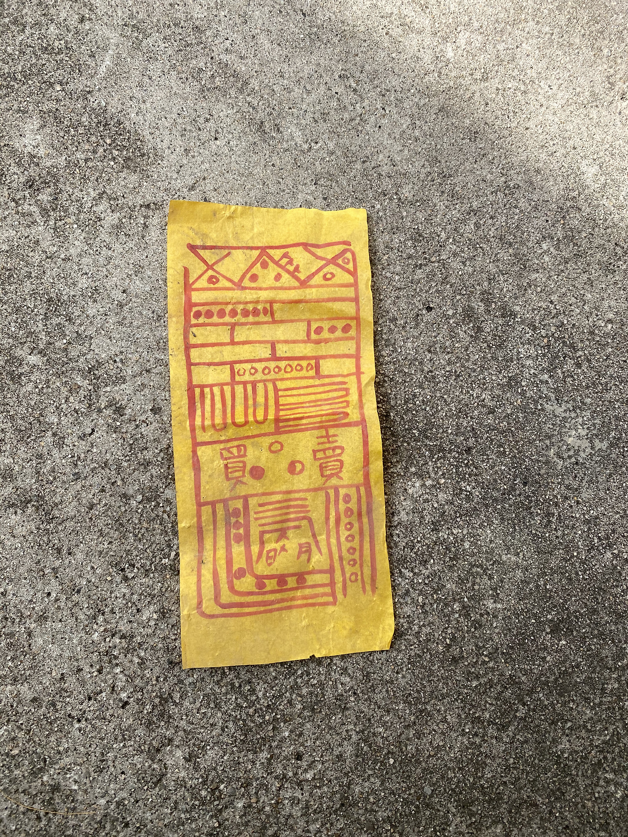 아저씨들이 공사하는 모습을 찍다가 그제 발견한 부적이 마당에 먼지를 뒤집어쓰고 있길래 털어서 주머니에 넣었다. 나는 부적 같은 걸 믿지 않지만 전에 살던 누군가는 자신과 가족의 안녕을 바라는 마음으로 이 부적을 벽에 붙였으리라. 아니면 새로 이사 온 사람이 전에 살던 사람이 미처 떼지 못하고 간 부적을 보고 “이건 뭐야?” 하고 벽지를 덧대 발랐을지도 모른다.