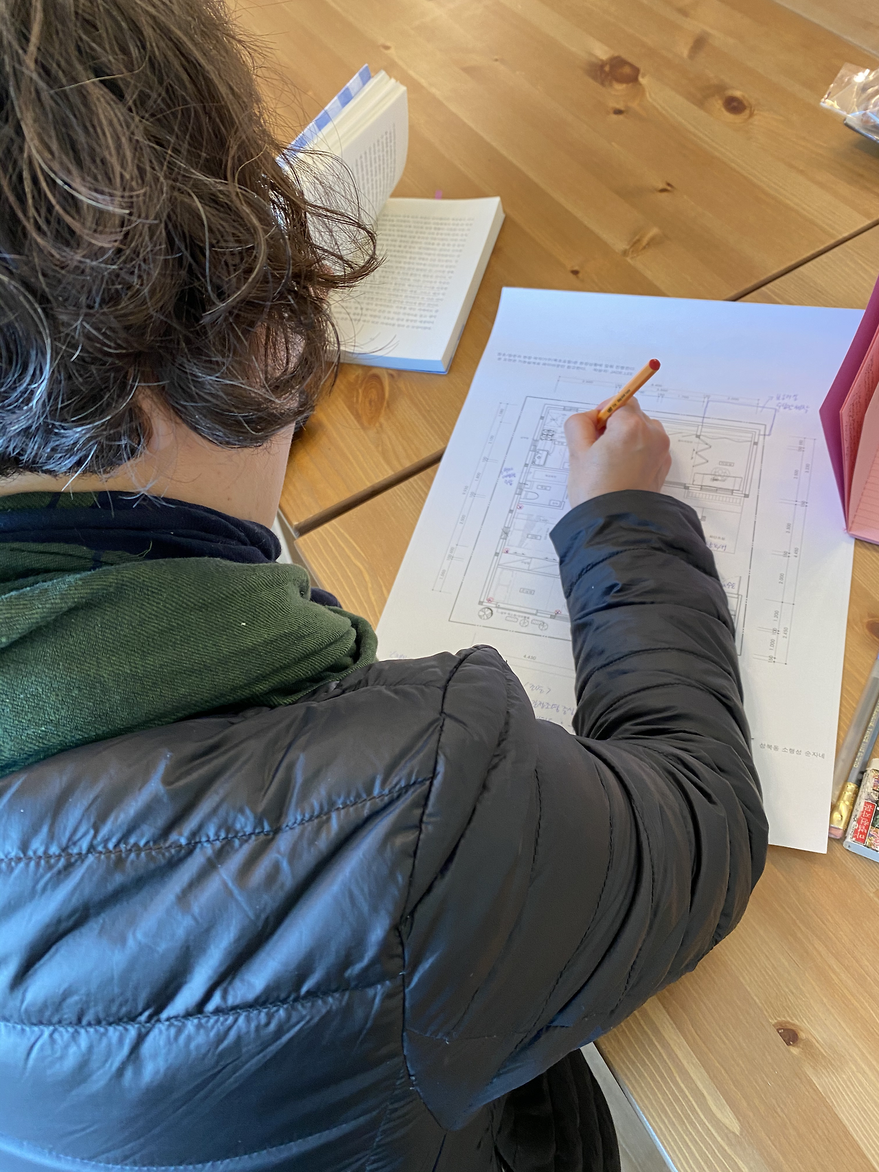 옆집이 바로 보이게 되어 있던 침실 창은 포기한다. 대신 침실은 최대한 밝고 따뜻한 방으로 만든다. 주방과 거실 등 사무공간 바닥은 최소한 단순하고 깨끗한 재질로 한다. 임 목수님은 마당과 댓돌 근처를 살릴 방법을 계속 고민 중이다.