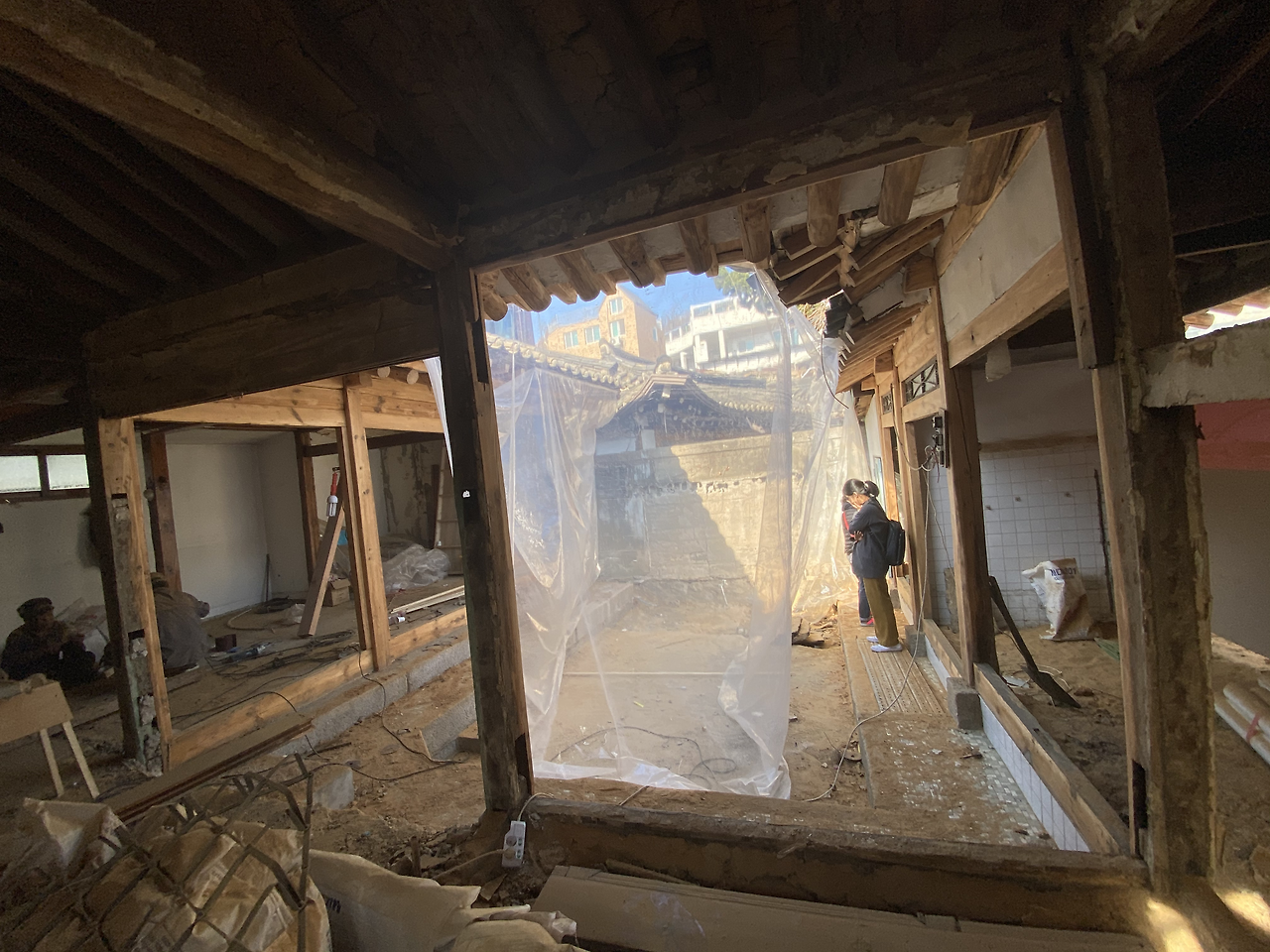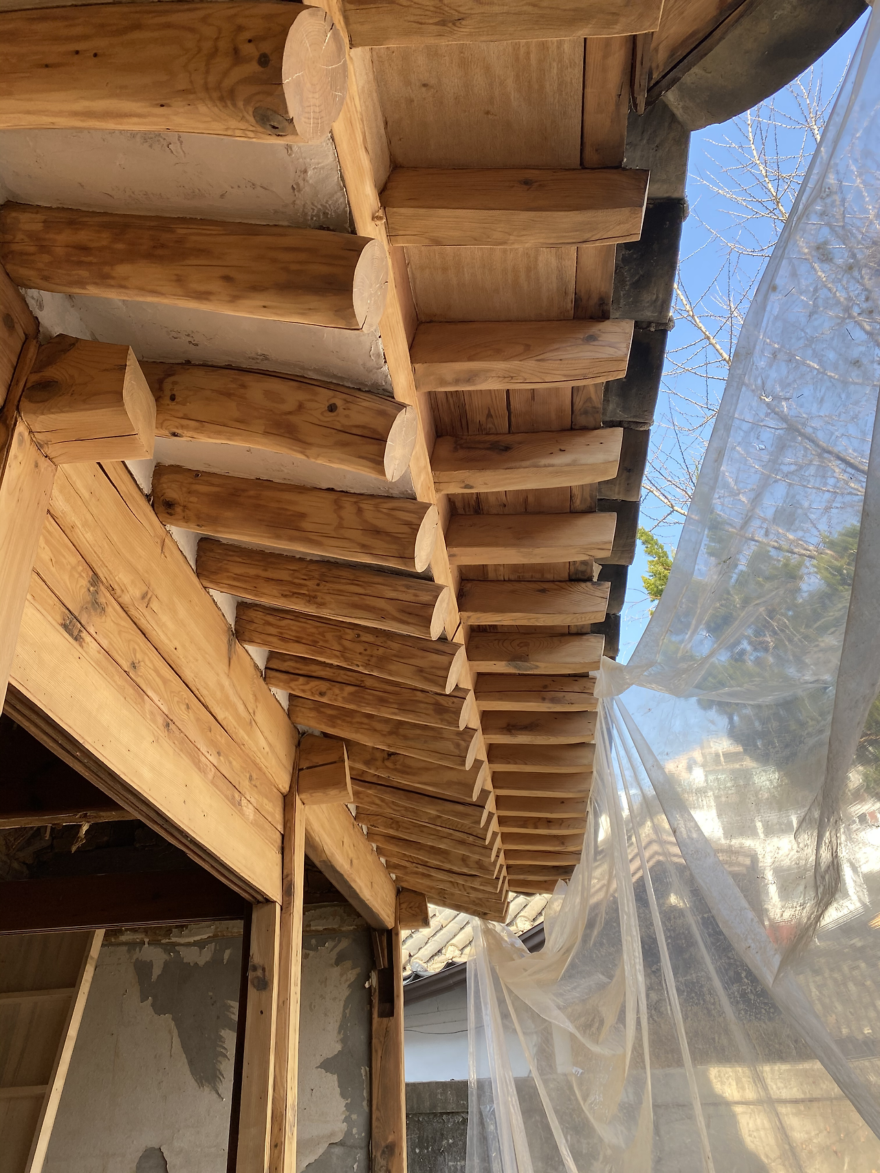 인부 두 분이 대문까지 온통 비닐로 막아놓고 안에서 전동대패 작업을 하고 계셨다. 우리가 들어가자 비닐에 묻은 톱밥들이 온통 옷에 달라붙었다. 바닥엔 톱밥 먼지가 그득했지만 깎아낸 서까래와 기둥들은 묵은 때를 벗고 뽀얀 얼굴로 마당을 쳐다보고 있었다.