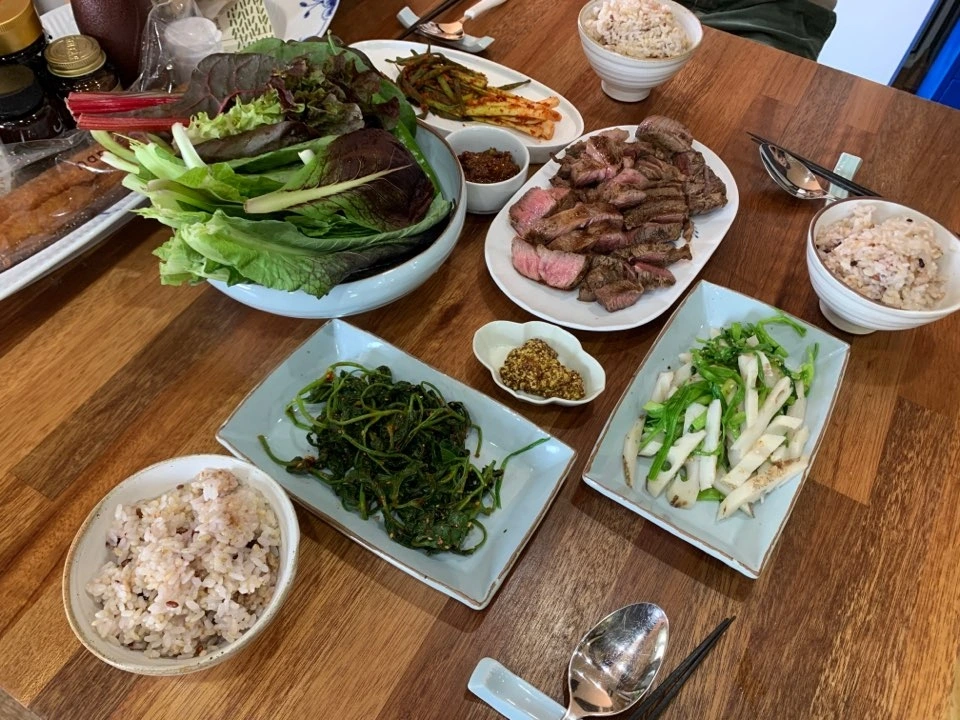 오늘 점심때 파란대문집 이정옥 대표가 와 같이 밥을 먹기로 해서 아내가 나물을 무치고 고기를 조금 구워 상을 차렸다. 이정옥 대표는 고맙게도 지난번에 수리할 한옥의 도면을 그려 주었고 누구보다도 '성북동 소행성 시즌2'를 응원해 주고 있다. 이 대표가 '미나리연근무침'이 너무 맛있다고 감탄을 하며 밥 한 그릇을 깨끗이 비웠다. 밥을 다 먹고 깎기 작업이 한창인 한옥집으로 내려갔다.
