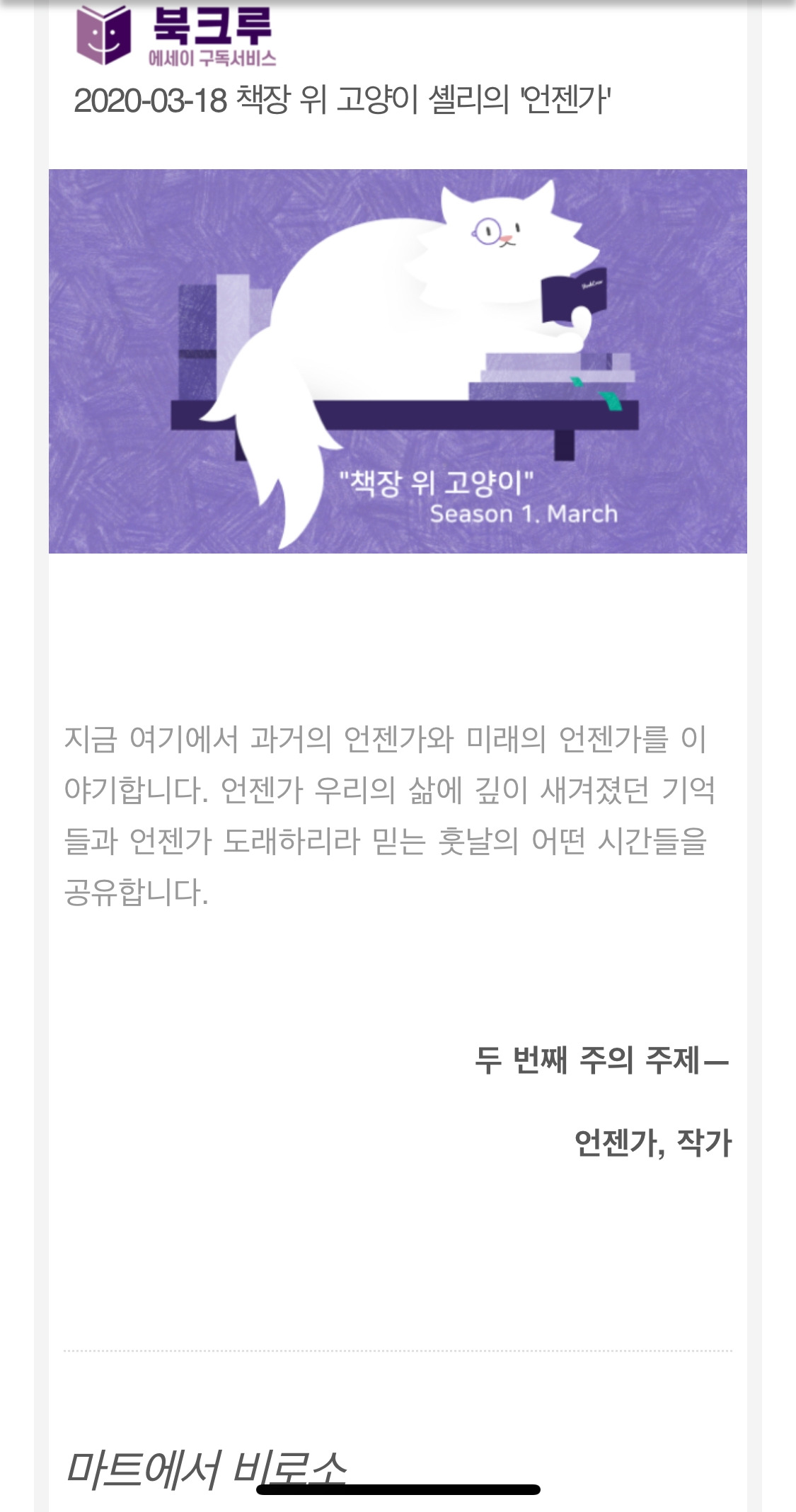 요즘 북크루의 에세이 구독서비스 '책장 위 고양이'를 구독하고 있다. 그러니까 나는 소설가나 시인이나 에세이스트나 파워 라이터 등이 합심해서 마감일에 시달려 가며 쓰는 신작 에세이들을 매일 한 편씩, 9주 동안 이메일로 받아 읽는 유료 구독자가 된 것이다(당연하다. 구독료를 냈으니까). 지난 주가 첫 번째 발송일이었고 첫 주제는 '언젠가, 고양이'였는데 놀랍게도 보내온 글들이 두 편 빼고는 다 재미가 없거나 성의가 없어서 매우 실망스러웠다((김*섭 작가와 정*우 작가의 글은 좋았다) 혹시나 해서 글을 다 모아놨다. 다시 읽어봐도 안 좋은가 보려고.