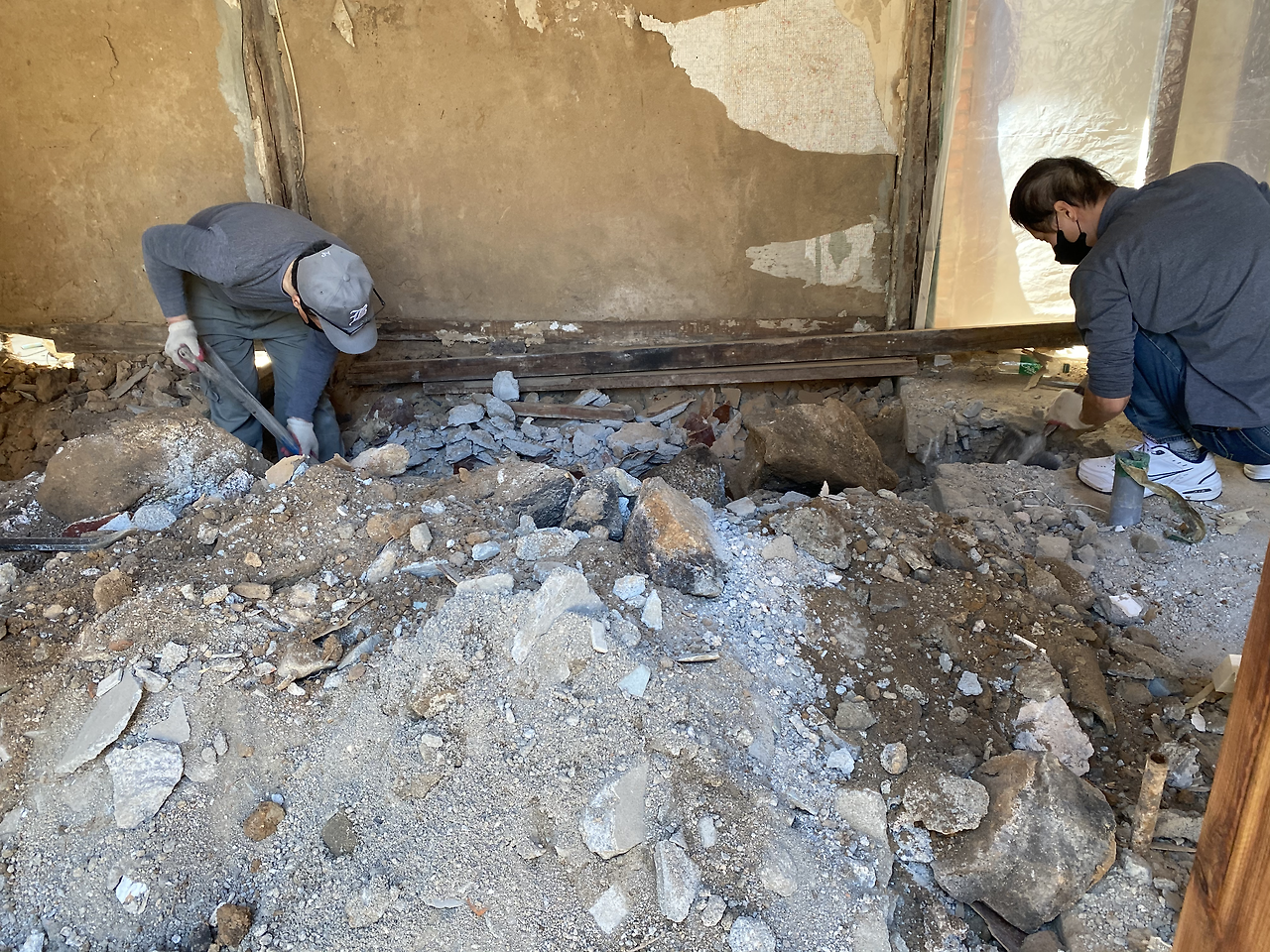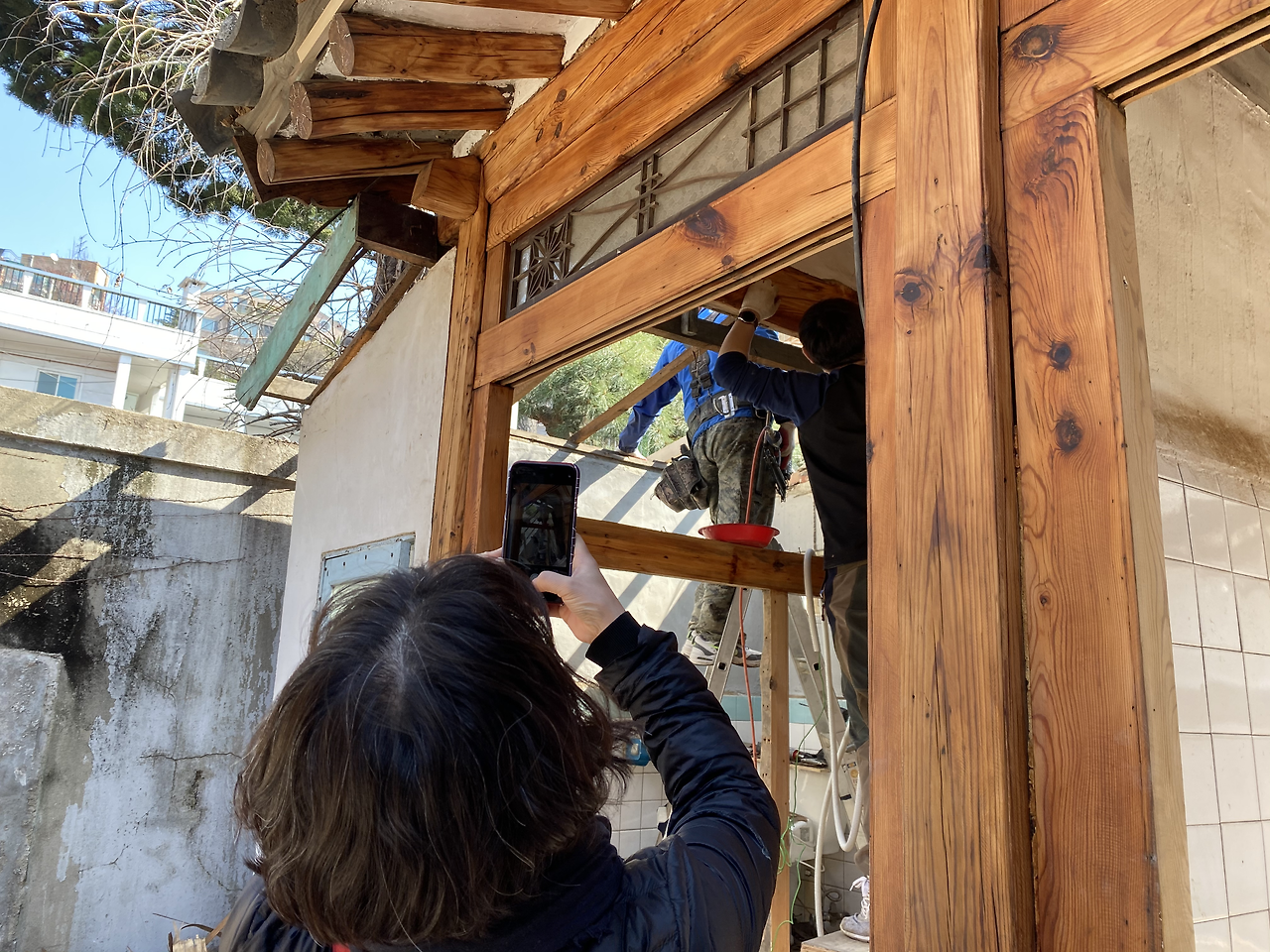 임정희 목수님은 며칠 때 작은 붓을 들고 다니며 목재에 오일을 바르고 있다. 이런 꼼꼼한 작업으로 한 땀 한 땀 집이 완성되는 것이다. 김치열 목수님과 김정국 목수님은 침실과 안쪽 화장실 바닥을 파내 고르고 있었다. 오랜 세월 묻혀 있었을 돌들이 흙더미 위에서 고개를 내밀고 있었고 대문 쪽엔 배수와 전기 배선을 위해 확보해 놓은 플라스틱 파이프마다 목장갑을 끼워놓은 게 인상적이었다.