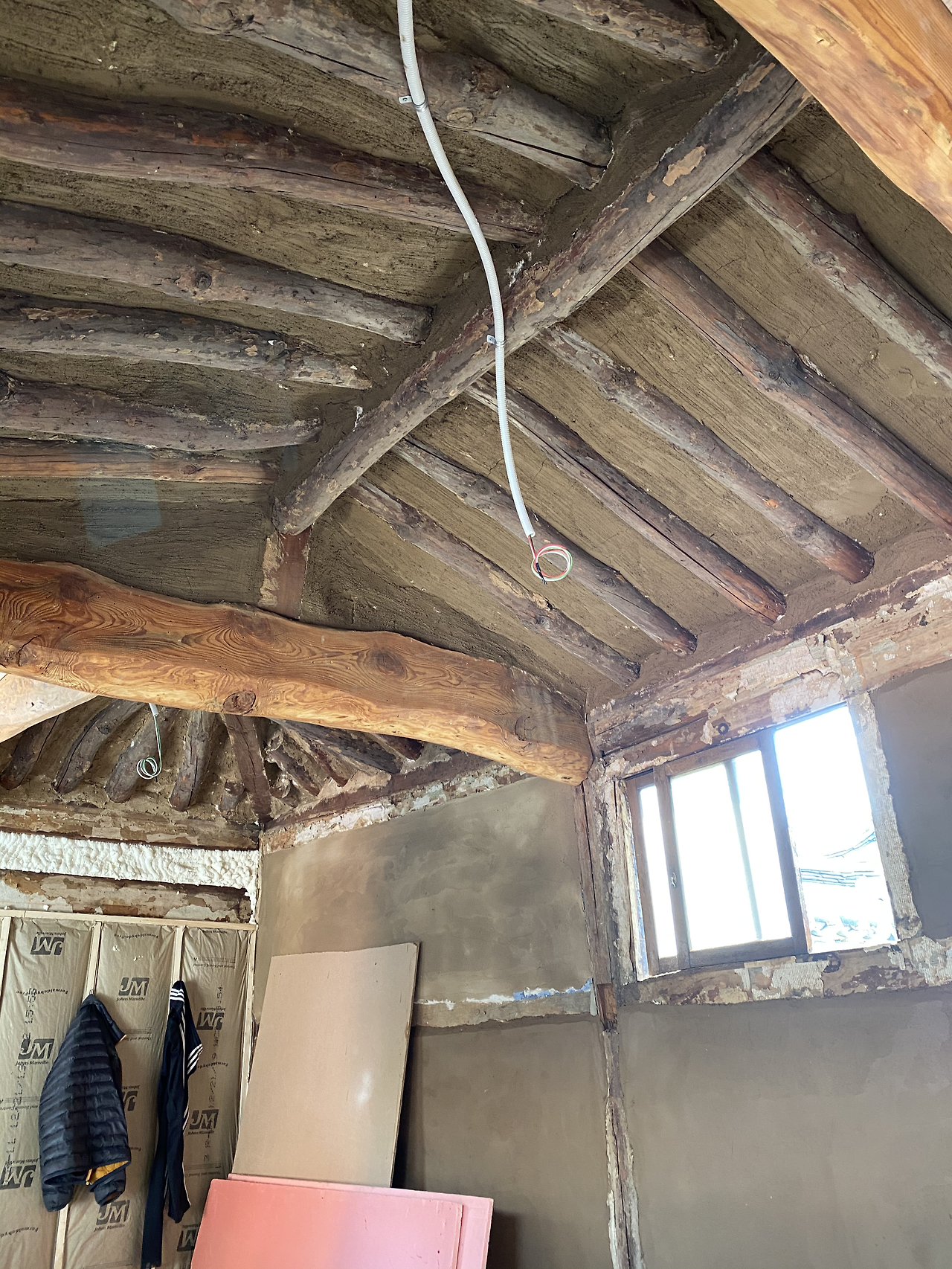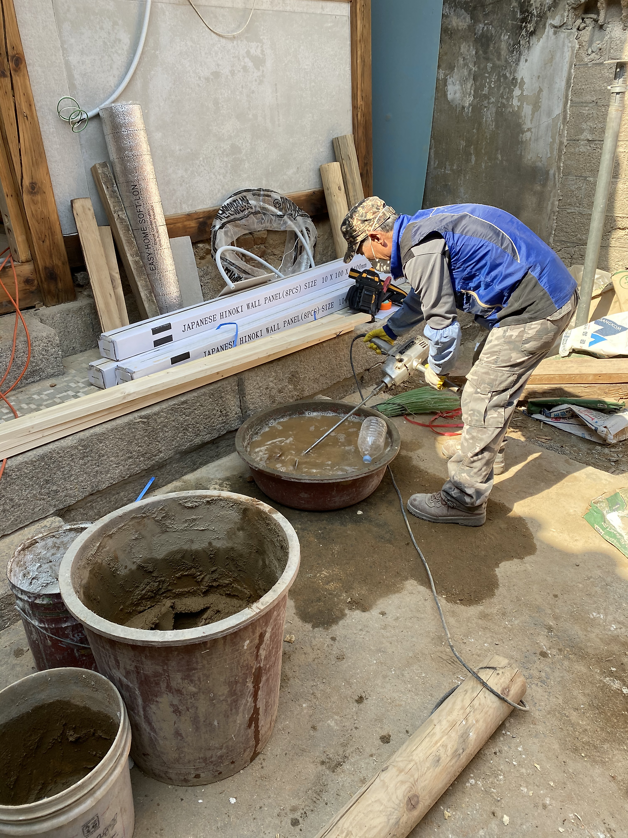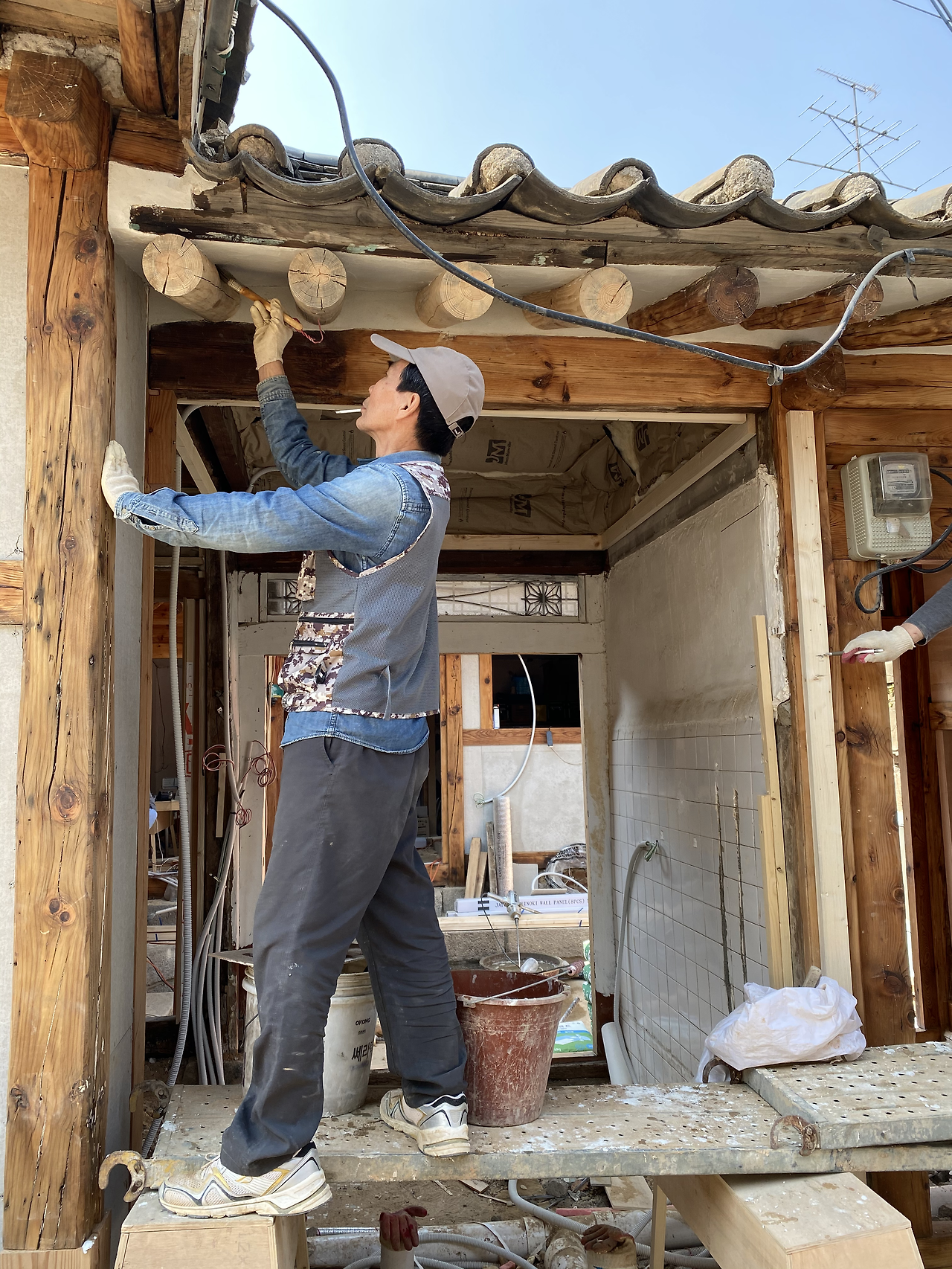 현장에 도착해보니 이필식 사장님을 비롯한 미장공들이 작업대 위에 올라가 천장 미장 작업을 하고 계셨다. 미장을 하기 전에 '인슐레이션'이라 불리는 유리섬유를 먼저 채워 넣고 그 위에 황토와 접착제를 섞은 걸 흙손으로 쓱쓱 처바르는 것이었다. 그렇게 정성을 다해 미장을 하고 나면 비로소 바람이 새지 않는 한옥이 완성되는 것이다. 임정희 목수님은 아직도 스티로폼으로 단열을 하는 경우가 가끔 있는데 요즘은 단열 효과가 좋아 웬만하면 이 방식을 쓴다고 설명했다.