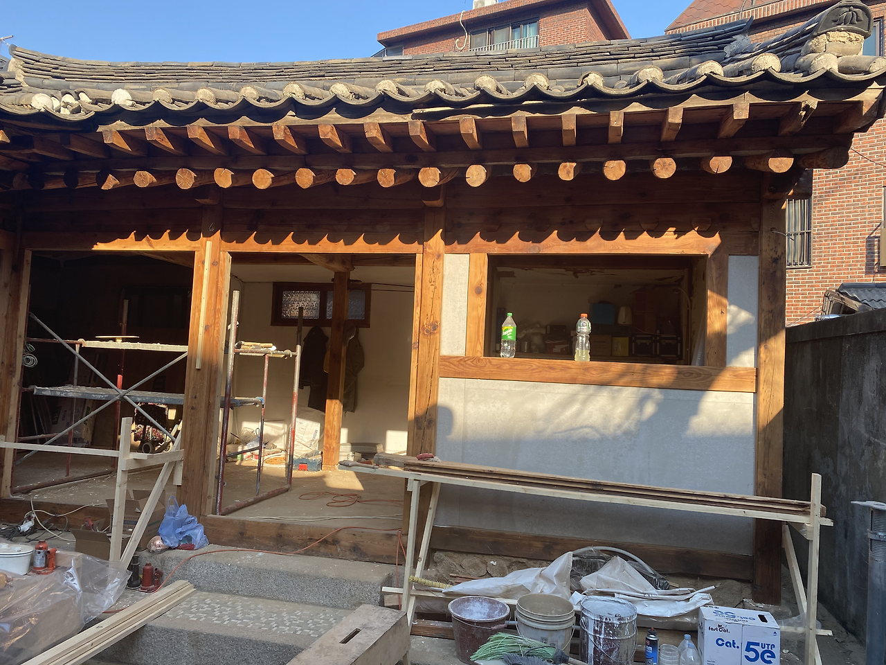 장석주의 책과 카잔차키스의 책을 번갈아 읽다가 문득 점심시간이 한참 지났다는 것을 깨달았다. 점심은 나가서 먹기로 하고 무작정 밖으로 나갔다. 나폴레옹 과자점이 있는 성북동 사거리 큰길을 건너자 삼선교 길엔 벚꽃들이 지전으로 피어 있었다. 꽃길을 따라 하염없이 걷다가 <상주식당>이라는 작은 식당으로 들어가 44년 간 식당을 했다는 할머니의 이야기를 들으며 청국장을 먹은 뒤 한옥 수리 현장으로 갔다. 김정국 목수님, 김치열 목수님과 인사를 하고 안으로 들어가니 임정희 목수님이 부지런히 움직이며 벽체들을 손보고 있었다. 아내가 지리산 가는 바람에 나 혼자 왔다고 했더니 이필식 미장 장인께서 "거기 가느라 오늘은 못 왔구먼"이라고 알은체를 했다. 아내와 내가 쓸 부부 침실 벽에 알루미늄 호일처럼 번쩍이는 난방재가 붙어 있길래 "이건 임시로 붙여 놓은 거예요?"라고 물었더니 임 목수님이 웃으며 그 위에 또 작업을 하게 되어 있다고 하면서 옆에 있는 인슐레이션을 가리켰다. 침실과 게스트룸 사이엔 난방재를 더 두껍게 보강하고 수납장도 넣을 거라서 소음 문제도 해결이 될 거라고 했다. 나는 '게스트룸에서 섹스를 해도 그 소리가 들리지 않게...'라고 김성준 선배와 농담하던 장면이 또 떠올랐지만 입 밖으로 소리 내어 말하지는 않았다. 임 목수님이 또 화를 낼 게 뻔하기 때문이었다. 아무튼 임 목수님이 애써주는 덕분에 따뜻하고 포근한 부부 침실이 될 것이다.