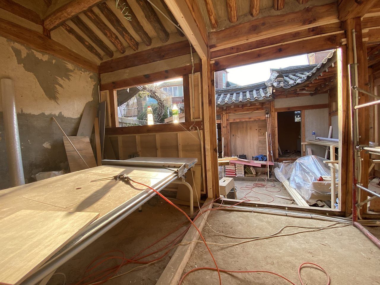 일요일인 오늘 아침엔 배가 고프다고 새벽부터 난리를 치는 순자에게 사료를 꺼내 주고는 샤워를 한 뒤 산책이나 할까 하다가 한옥 공사 현장에 가보기로 했다. 늘 소란한 현장이지만 작업이 없는 일요일 아침만큼은 너무도 조용하다는 것을 알고 있기 때문이었다. 대문을 열고 들어서니 아침 햇살을 받고 있는 나의 작업실 창문이 보였다. 작동을 멈춘 공구들이 선반 위에 놓여 있고 창틀엔 작업 도구들과 음료수 페트병 들이 놓여 있다. 바닥엔 임정희 목수님이 벗어놓고 간 운동화도 보였다. 고요하고 아름다웠다. 나는 스마트폰으로 사진을 찍으며 그 고요의 순간들을 만끽했다. 이것저것 걱정이 많지만 그런 것들은 내일부터 다시 하면 된다고 생각했다. 지금은 이렇게 조용하고 침착한 집안의 공기를 온몸으로 느끼기만 하자. 그런 생각을 하다가 조용히 대문을 닫고 나왔다. 다시 오지 않을 소중한 시간이었다.
