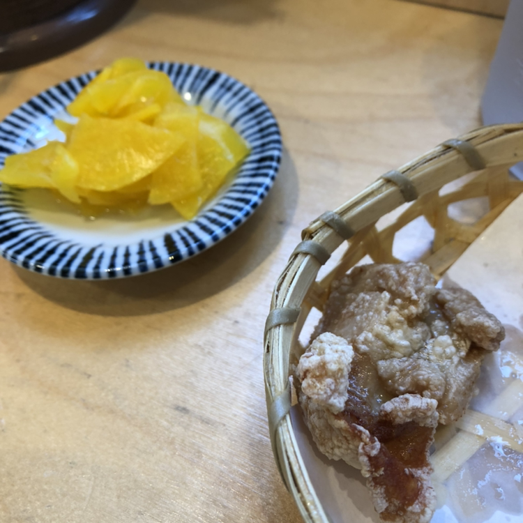 스마트폰으로 검색을 해보니 '아부라카스'는 소의 장을 시간을 들여 기름에 푹 튀겨낸 것이라고 하더군요. 기다리는 동안 치킨가라아게도 두 점을 주셨습니다. 언제나처럼 고마운 환대입니다.
