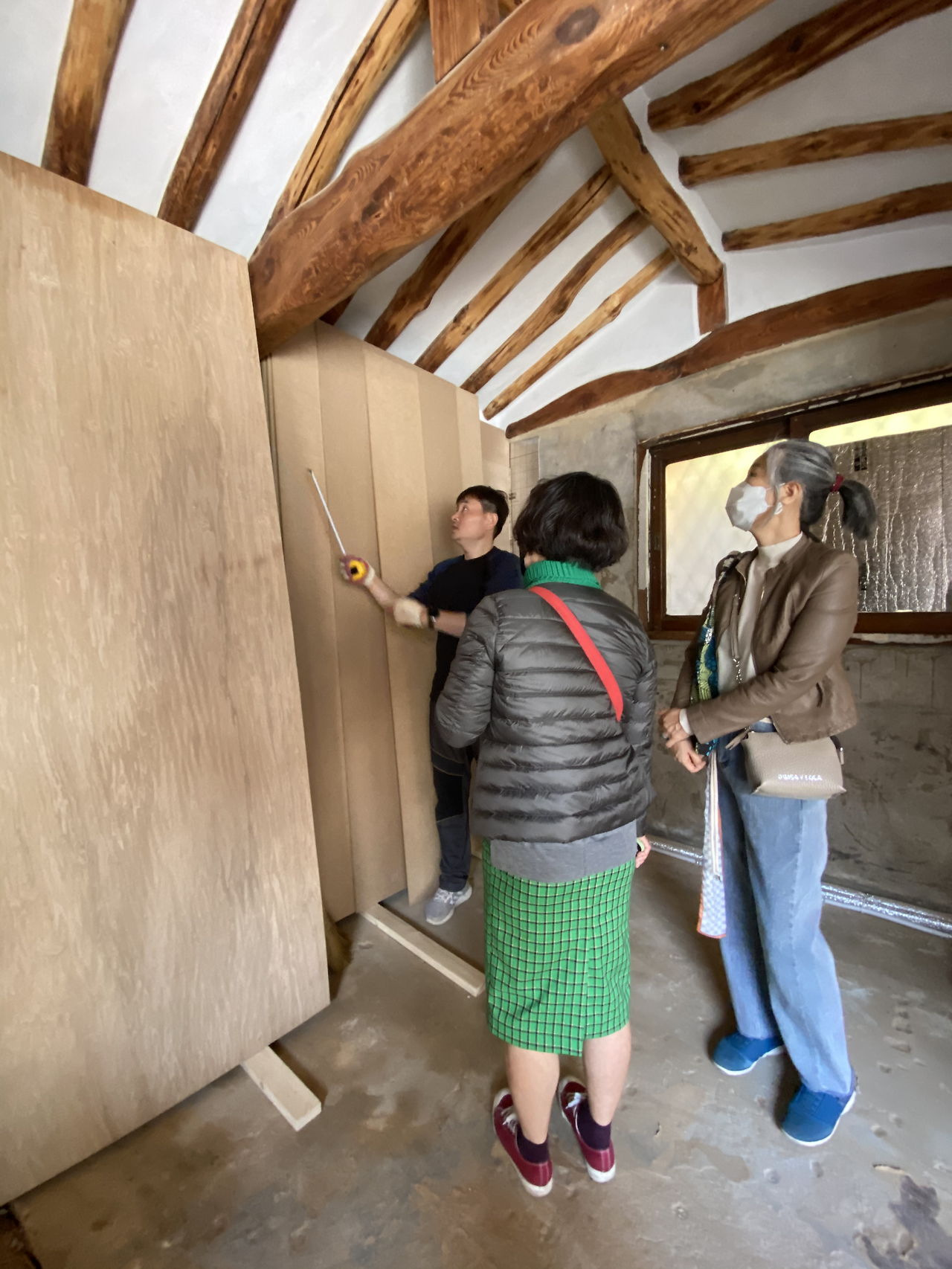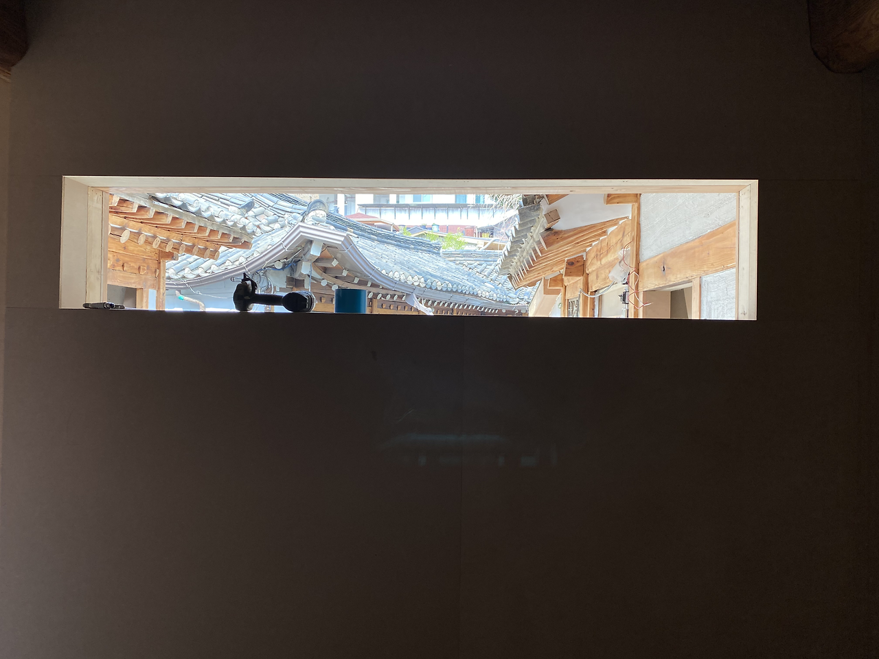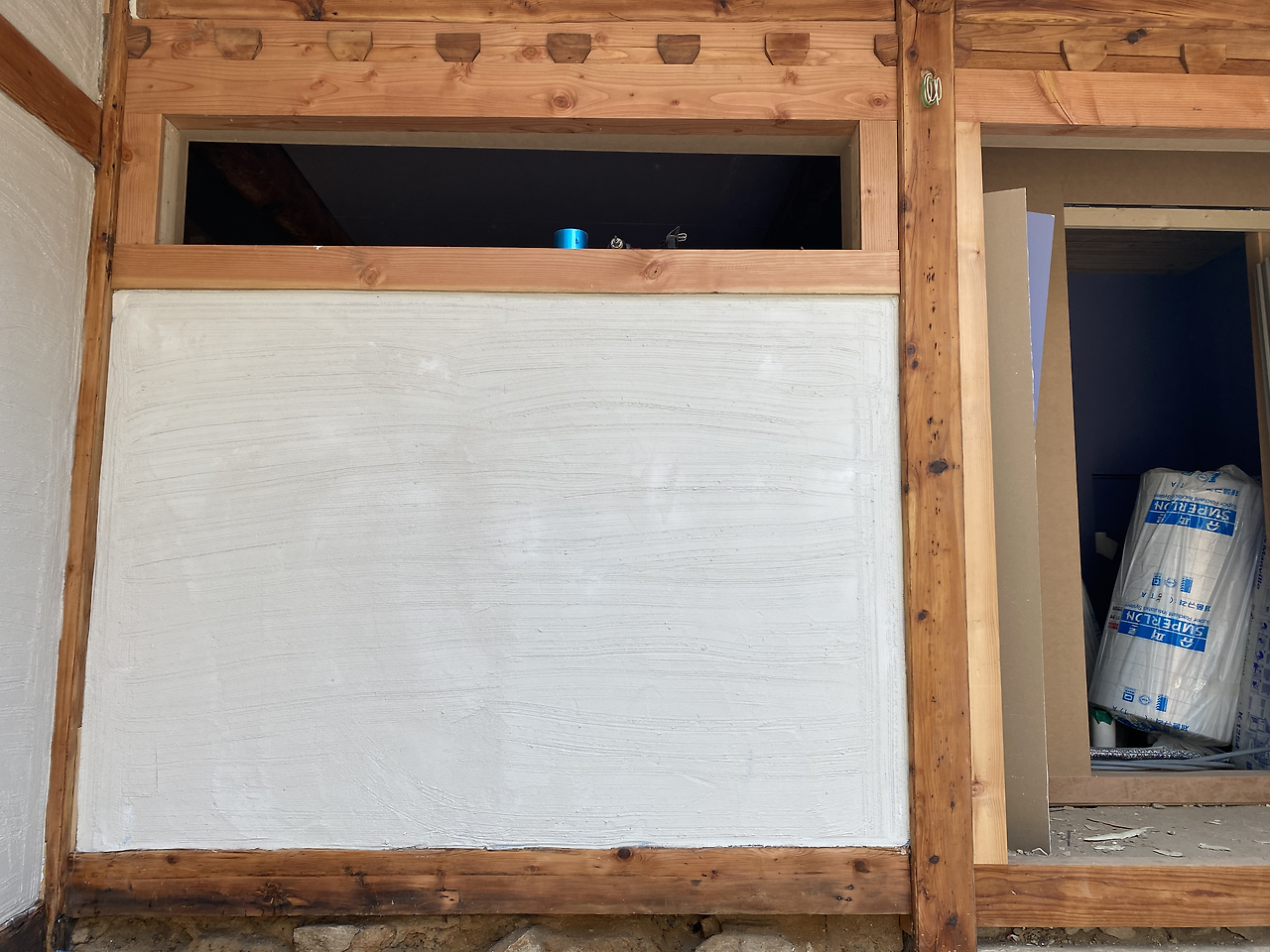 현장에 갔더니 임정희 목수님, 김치열 목수님, 김정국 목수님, 이필식 미장 장인 등 총 일곱 분이 각자 분주하게 맡은 바 일을 하고 있었고 아내와 강순희 선생이 공사 현장을 둘러보고 있었다. 나는 강순희 선생과 반갑게 인사를 나누고 공사하고 있는 집 공간들에 대해 거칠게 설명을 해드렸다. 이야기를 나누며 살펴보니 마당에서 보이는 부부침실쪽 회벽이 어느새 다 칠해져 있었다. 아름다웠다. 침실과 게스트룸 사이의 옷장도 만들어지고 있었다. 침실에서 밖으로 보이는 창의 프레임이 멋져서 또 사진을 한 장 찍었다. 아내는 임 목수님과 주방 씽크대와 수납공간에 대해 이야기를 나누고 있었다. 강순희 선생은 한옥이 너무 멋지다고 감탄을 거듭하셨고 내가 툇마루가 놓일 곳들에 대해 말씀드렸더니 다 만들어지면 너무 좋겠다고 손뼉까지 치셨다. 요즘 코로나 19 때문에 서천에 있는 남편을 두 달이나 못 봤다고 하길래 내가 "우와, 그 정도면 거의 헤어진 수준인데요?"라고 농담을 했다. 임 목수님이 방금 필요한 공사비를 더 보내 달라고 했다고 아내가 말하길래 이따가 입금을 해드리겠다고 대답했다.