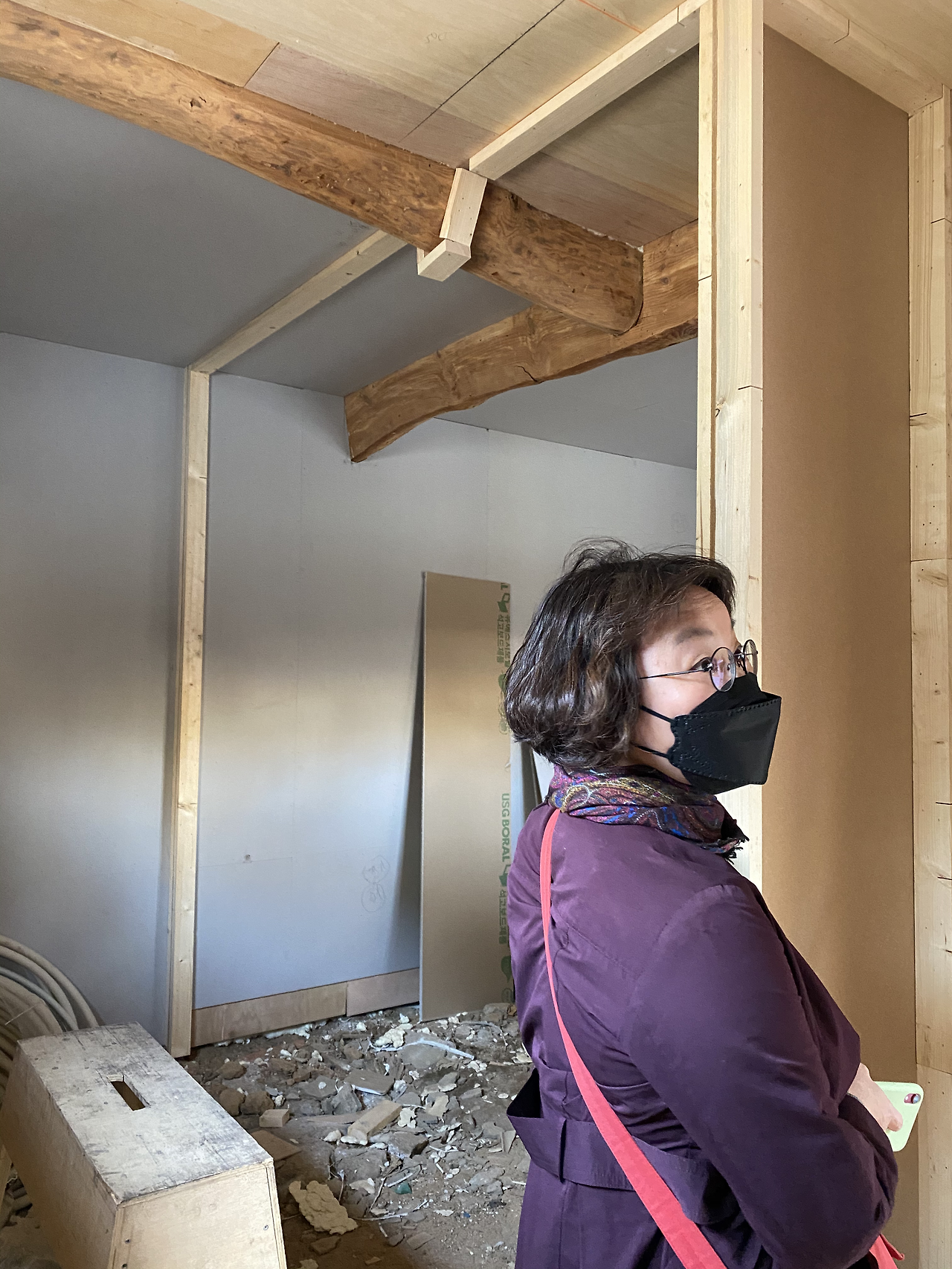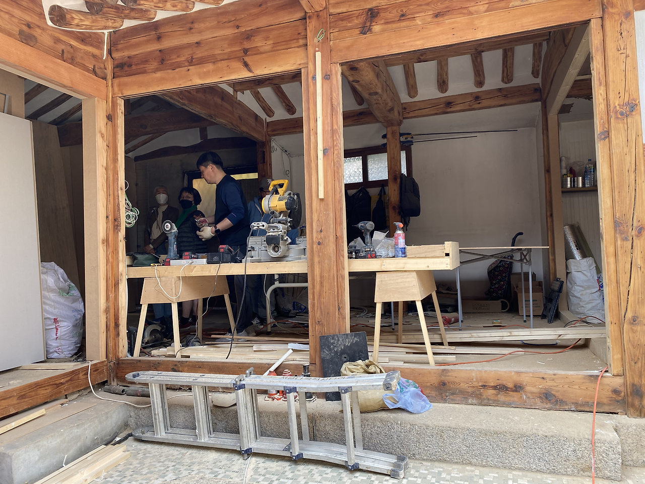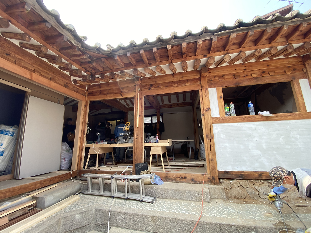 현장에 갔더니 임정희 목수님, 김치열 목수님, 김정국 목수님, 이필식 미장 장인 등 총 일곱 분이 각자 분주하게 맡은 바 일을 하고 있었고 아내와 강순희 선생이 공사 현장을 둘러보고 있었다. 나는 강순희 선생과 반갑게 인사를 나누고 공사하고 있는 집 공간들에 대해 거칠게 설명을 해드렸다. 이야기를 나누며 살펴보니 마당에서 보이는 부부침실쪽 회벽이 어느새 다 칠해져 있었다. 아름다웠다. 침실과 게스트룸 사이의 옷장도 만들어지고 있었다. 침실에서 밖으로 보이는 창의 프레임이 멋져서 또 사진을 한 장 찍었다. 아내는 임 목수님과 주방 씽크대와 수납공간에 대해 이야기를 나누고 있었다. 강순희 선생은 한옥이 너무 멋지다고 감탄을 거듭하셨고 내가 툇마루가 놓일 곳들에 대해 말씀드렸더니 다 만들어지면 너무 좋겠다고 손뼉까지 치셨다. 요즘 코로나 19 때문에 서천에 있는 남편을 두 달이나 못 봤다고 하길래 내가 "우와, 그 정도면 거의 헤어진 수준인데요?"라고 농담을 했다. 임 목수님이 방금 필요한 공사비를 더 보내 달라고 했다고 아내가 말하길래 이따가 입금을 해드리겠다고 대답했다.
