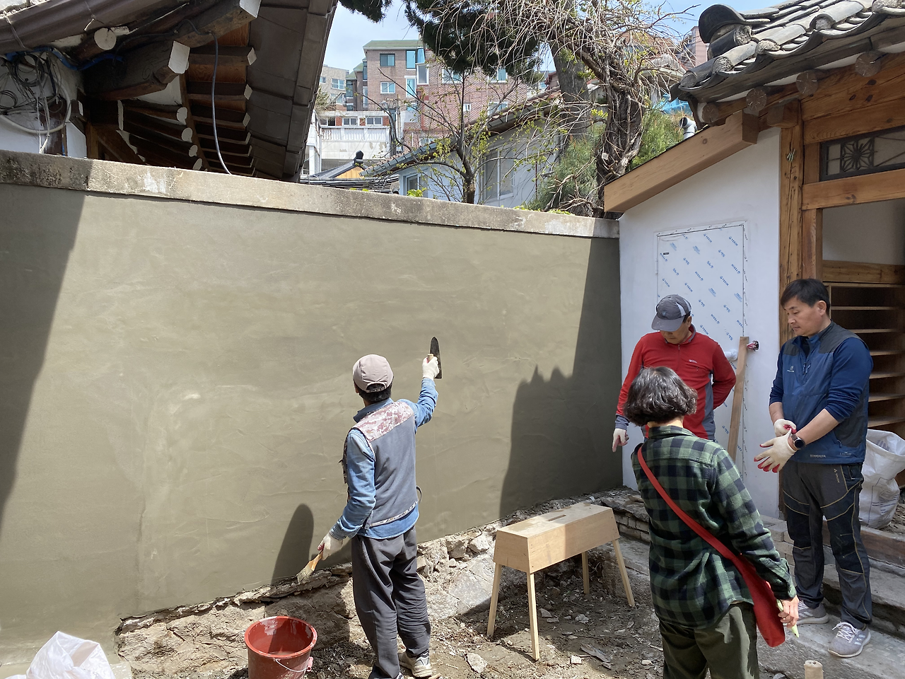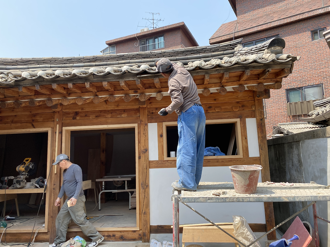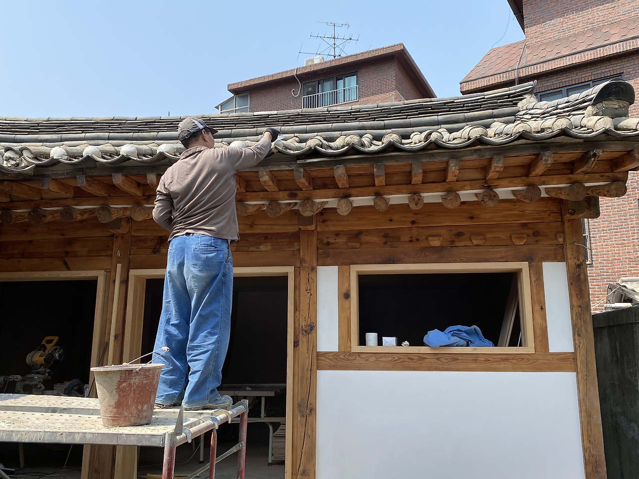 오후에 다시 현장으로 가보니 이필식 장인이 기와 끝을 수막새 대신 하얀 시멘트로 마감을 하고 있길래 저건 뭐로 만드는 거냐고 물었더니 '줄눈, 백세멘, 흑세멘을 섞어 만든 것'이라는 대답이 돌아왔다. 어제보다 한층 높아진 비계 위에 올라가서 기와 끝을 마감하는 이필식 사장을 바라보면서 아내가 "나는 저런 데 올라가서 절대 일 못해"라며 고개를 절레절레 저었다. 대문 밖으로 나오니 하얀 부대에 담겨 있는 쓰레기들이 또 한가득이다. 공사를 하는 내내 폐기물 쓰레기는 계속 나오는데 가끔 우리 집에서 나온 게 아닌 게 섞여있을 때가 있다고 한다. 다른 집에서 야금야금 쓰레기를 가져다 놓는 것이다. "그러면 그냥 놔뒀다가 같이 치워요. 어차피 한 트럭에 실어 보내면 되니까. 대신 그거 버린 사람들이 민원을 넣거나 신고를 하진 않을 거 아녜요." 임 목수님이 이렇게 말하면서 웃었다. 공사를 하다 보면 시끄럽거니 먼지가 많이 난다고 구청에 항의나 신고를 하는 사람들이 가끔 있는데 공사 총책임자는 늘 그런 것까지 해결해야 하기 때문에 생각하는 게 남다른 것이다. 우리는 "저희 가볼게요. 수고하세요."라고 하고는 얼른 현장을 빠져나왔다.