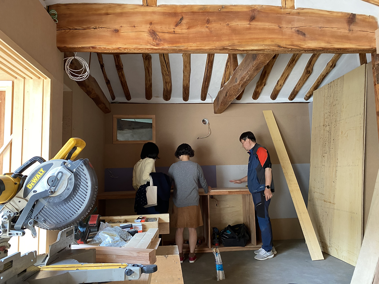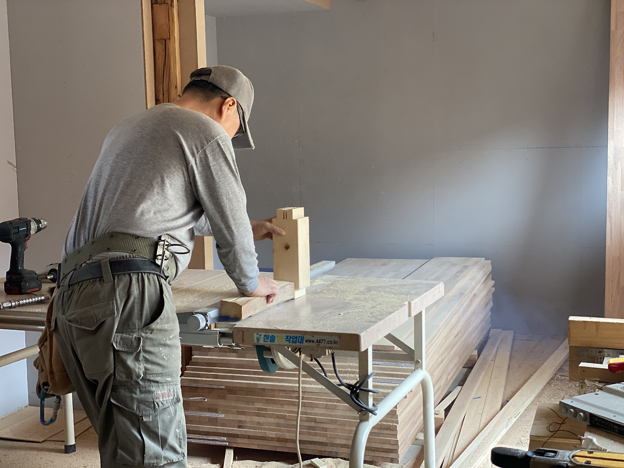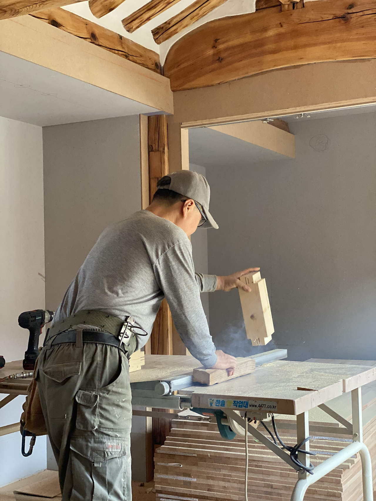 막내 김정국 목수님은 이틀째 안채와 게스트룸의 보일러실마다 단열 공사를 하느라 여념이 없다. 혹시 겨울에 얼지 몰라서 보일러 주변을 따뜻하게 보강하는 작업인데 흡사 작은 집을 짓는 정성을 들이고 있다. 아내가 "보일러실에 방이 하나 더 생기는 느낌이야!"라며 좋아했다. 김치열 목수님은 혼자서 계속 나무를 썰고 깎고 하더니 툇마루를 거의 다 만들었다. 회전톱날 앞에서 나무를 깎는 모습을 지켜보아도 놀랍기는 마찬가지다. 나무를 톱니처럼 깎아서 90도로 꺾어 딱 맞추면 못을 쓰지 않고도 견고함을 자랑하는 아름다운 마루로 변신한다. 게스트룸 입구에서 시작해 부부침실을 거쳐 마루에 이르는 공간까지 저 툇마루가 놓일 것이다. 비가 오는 날 저기 앉아 떨어지는 빗소리를 들으면 얼마나 좋을까 상상하면 벌써 가슴이 뛴다.