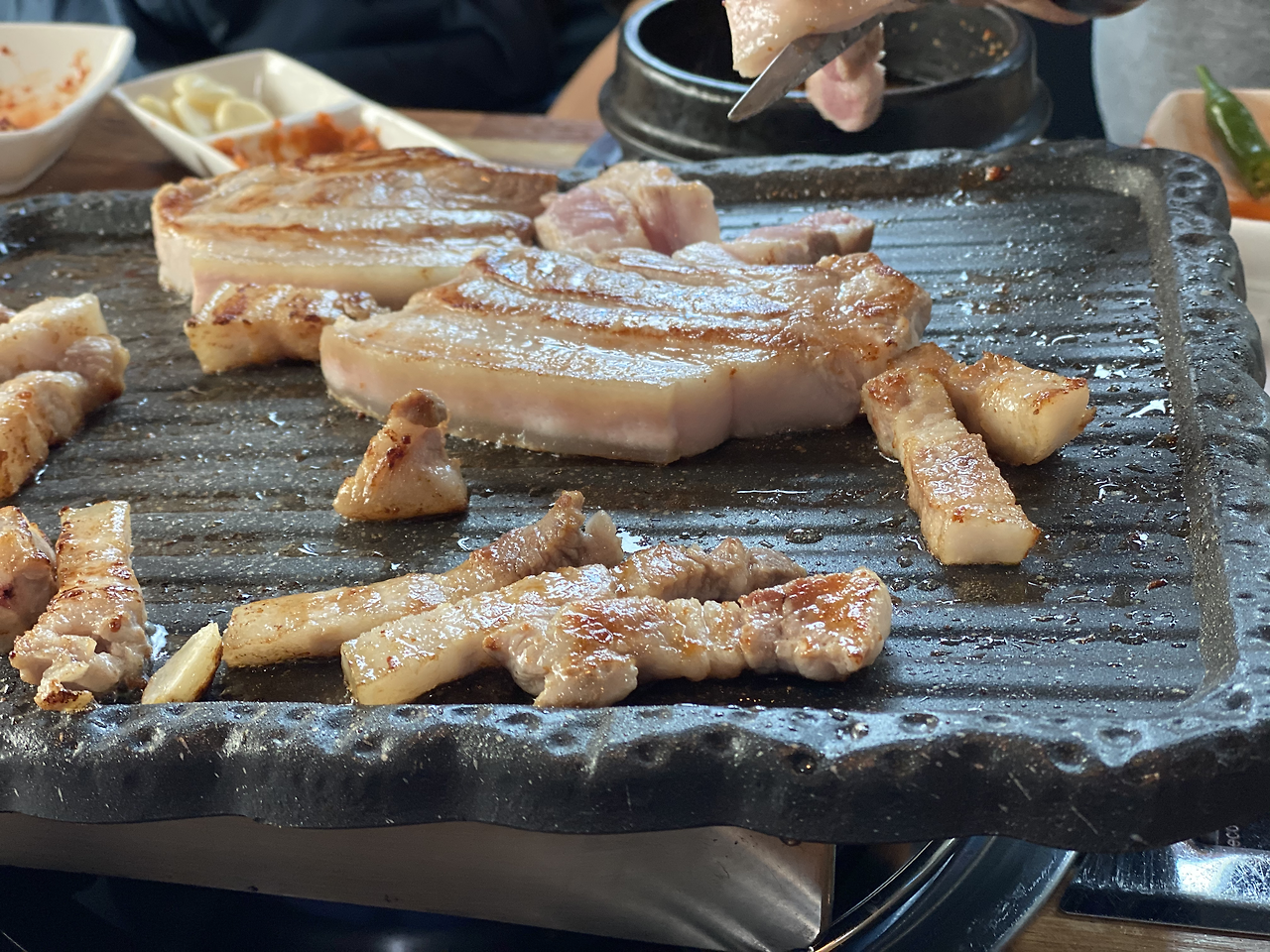 작업일은 아직도 많이 남았지만 미장 공사가 거의 끝나가기 때문에 점심때 간단한 회식을 하기로 했다. 목수님들이 늘 점심을 먹는 '성북로 10길'에 전날 미리 가서 고기 불판을 놓아달라고 부탁했다. 소고기를 팔지 않는 집이라 돼지고기를 먹기로 했는데 전날 저녁에 목살이 다 나가서 삼겹살밖에 없다고 했다. 목수님들에게 물어보니 삼겹살만 먹어도 좋다고 하셨다. 하긴 이 집은 삼겹살 품질이 워낙 좋아서 별 상관은 없을 것 같았다. 임 목수님이 술을 안 마시기에 간단하게 맥주 두 병만 시켜서 나와 김치열 목수, 김정국 목수만 건배를 했다. 우리 테이블에서는 내가 고기를 굽기 시작했는데 뭐든 손으로 하는 건 서툰 내가 고기 굽는 걸 못마땅한 눈초리로 처다보던 김치열 목수님이 결국 집게와 가위를 빼앗아 갔다. 고기를 노릇노릇하게 구워 불판 한쪽에 일렬로 착착 배열하는 솜씨가 나와는 전혀 달랐다.