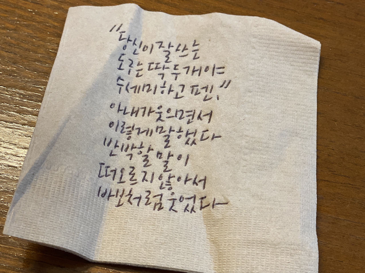 “당신은 어쩌면 그렇게 도구 사용이 서툴러? 포크질 하는 거 보면 참... 당신이 잘 쓰는 도구는 딱 두 가지야. 수세미하고 펜.”