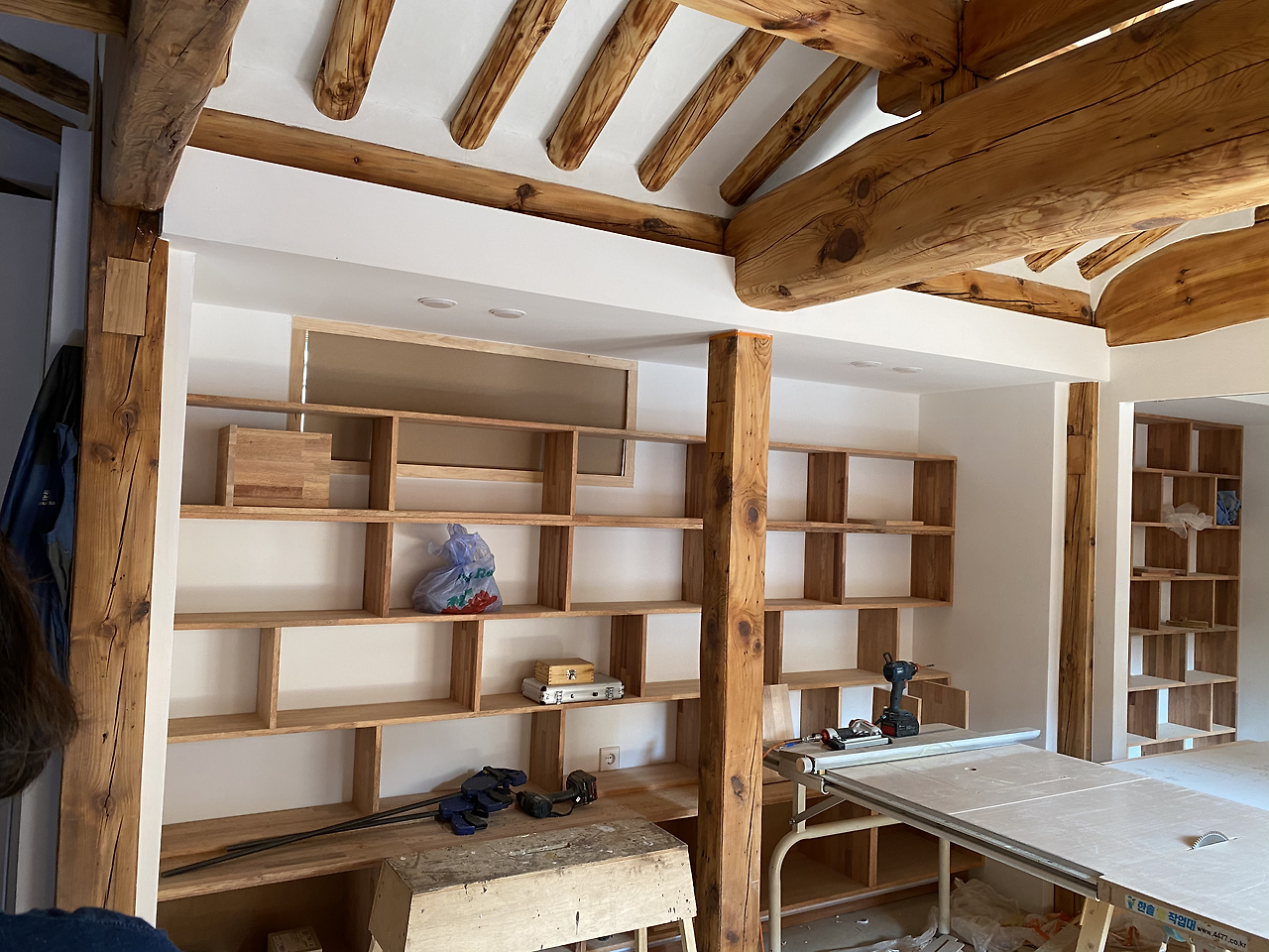 내 작업실에 이어 마루 책꽂이도 완성이 되어가고 있다. 책꽂이 아래쪽 공간은 큰 책이나 다른 소품을 수납할 수 있도록 문을 달았는데 마루 기둥 사이로 절묘하게 문이 열리게 설계되어 임정희 목수님과 아내의 감탄을 불러일으켰지만 정작 이 놀라운 일을 해낸 김치열 목수님은 ‘어쩌다 얻어걸린 것’이라며 겸손을 떨었다. 드디어 자태를 드러낸 주방의 수납공간들이 오밀조밀하고 아일랜드 식탁 위에 걸릴 조명은 티크와 오크로 만들었다는데 흡사 오디오 스피커처럼 매끈하게 빠졌다. 월요일이면 도착할(우리 부부에게 주어진 선물인데 누가 주는 건지는 아직 비밀이다) 아일랜드 식탁 상판과 조명의 조화가 너무나 기대된다.