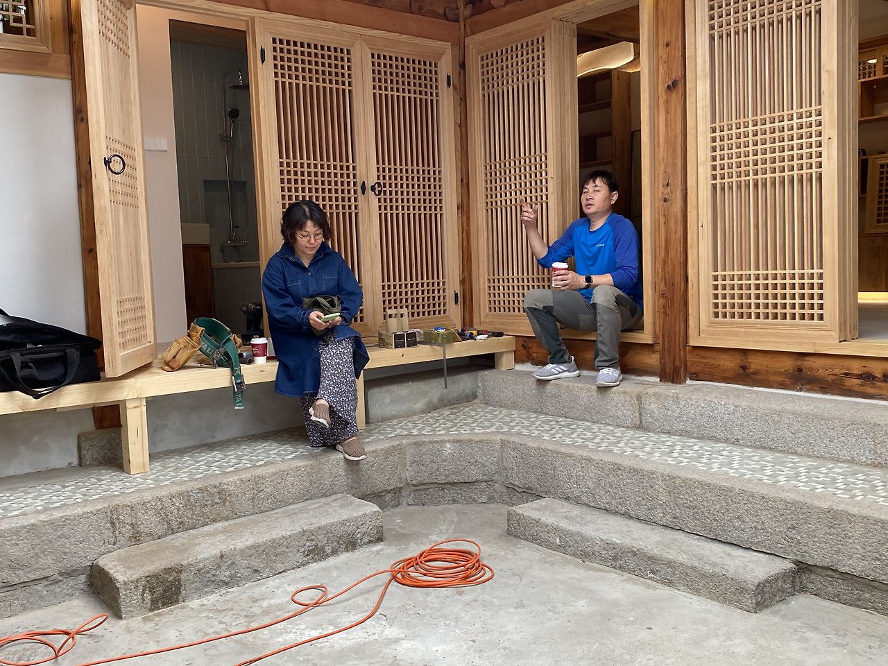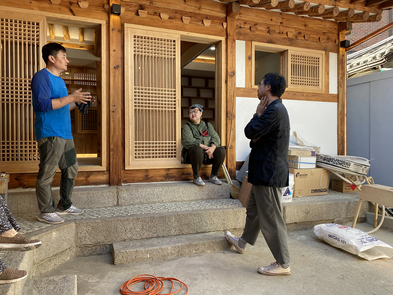 장준우 요리사 부부가 돌아가고 조금 있다가 페이퍼 정유희 편집장과 박창현 건축가가 대문 안으로 들어섰다. 정유희 편집장이 한옥 현장도 궁금하고 또 임정희 목수님에게 뭔가 조언을 구하고 싶은 것도 있어서 온다고 했던 것이다. 지금 프로젝트를 같이 진행하고 있는 박창현 건축가가 직접 임 목수님에게 질문을 했고 임 목수님은 최선을 다해서 대답을 해주었다. 정 편집장은 우리집이 너무 마음에 든다고 했고 집의 기운이 좋아서 좋은 일이 반드시 생길 것 같다고 말해 주었다. 박창현 건축가와는 25년 전부터 친구로 지냈는데 지금은 무슨무슨 건축상도 많이 타고 아주 건축계의 거물이 되었다고 하며 웃었다.