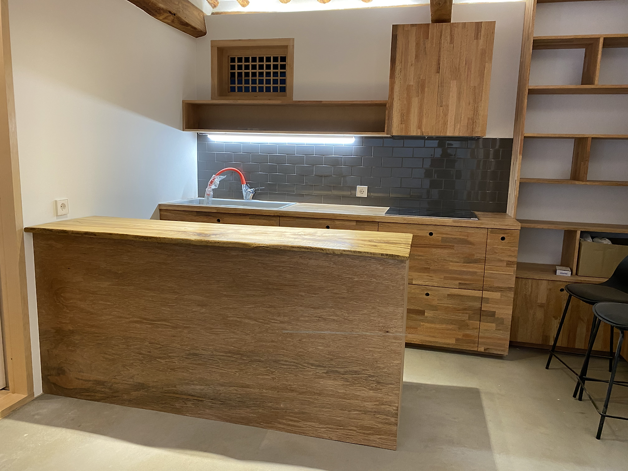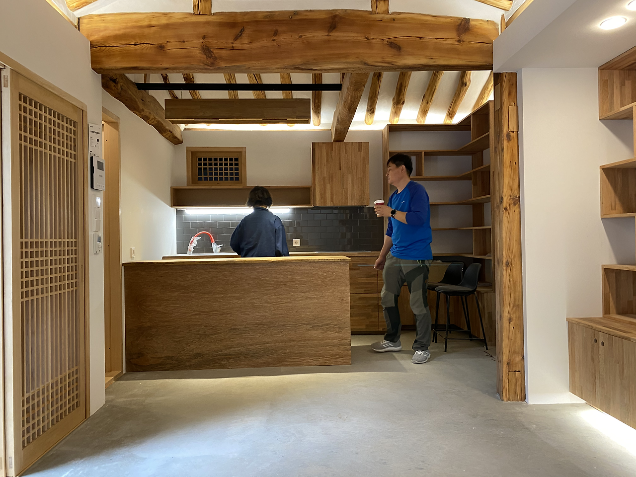 은곡도마의 은곡 선생이 직접 만들어 주신 회화나무 아일랜드 식탁 상판과 임정희 목수님이 만든 티크 조명은 기가 막히게 아름답다. 임 목수님은 "혹시 저녁에 와서 조명 켜봤어요?"라고 물었다. 우리가 미처 그건 못 해봤다고 웃으며 고개를 저었더니이 목수님이 "나는 그거 보려고 저녁 여덟 시까지 기다렸는데."라고 말했다. 순간, 식탁과 마루의 간접 조명과 마당의 불빛을 저녁에 느껴보고 싶은 마음에 네 시 반이면 모두 퇴근하는 현장에 혼자 앉아 있는 임 목수님의 모습이 떠올라 약간 숙연해졌다. 임 목수님은 오일을 바른 기둥과 문틀 들을 가리키며 이삼 년 지나면 색깔이 비슷해져 더 멋있을 거라고 말했다.