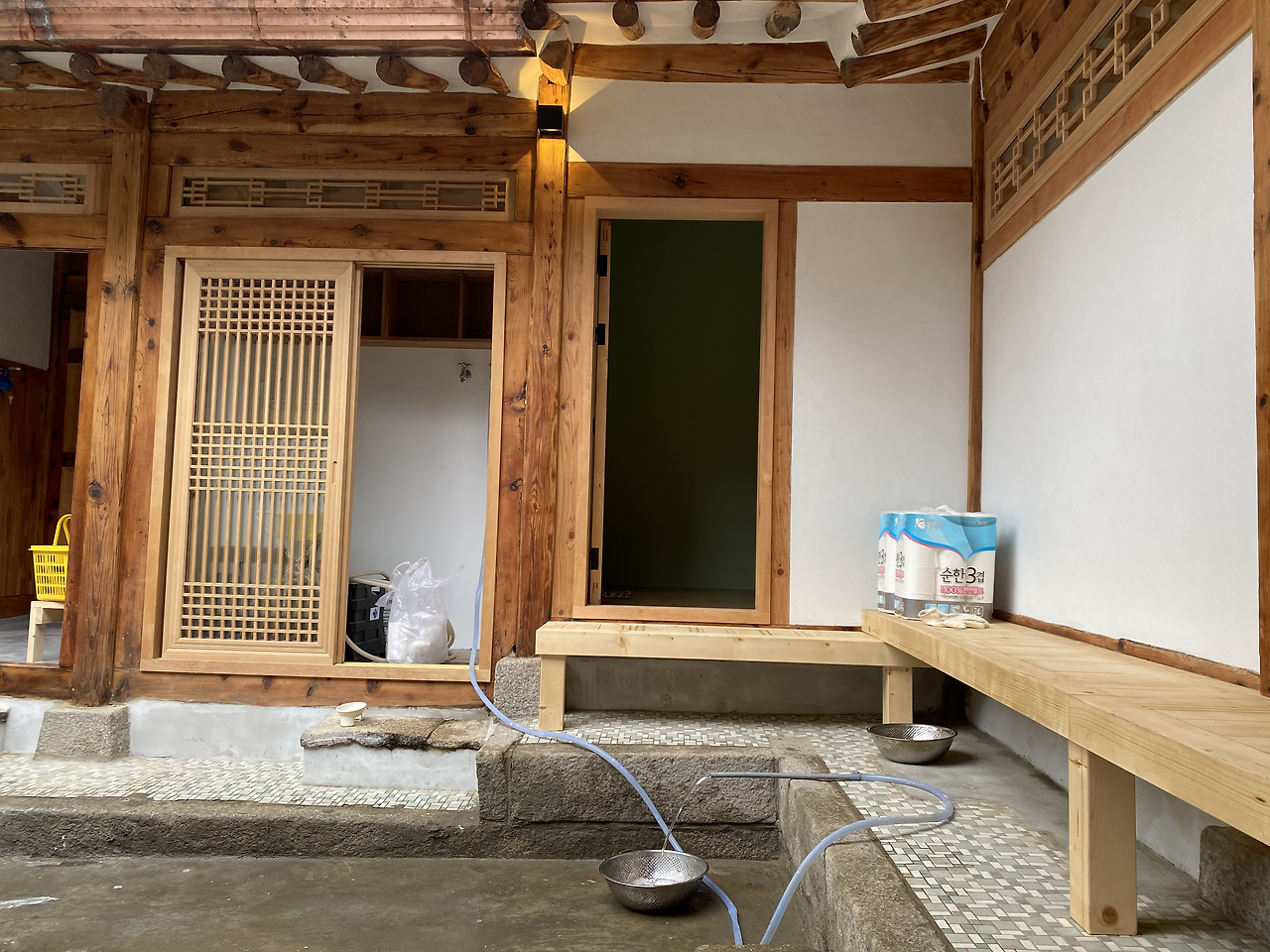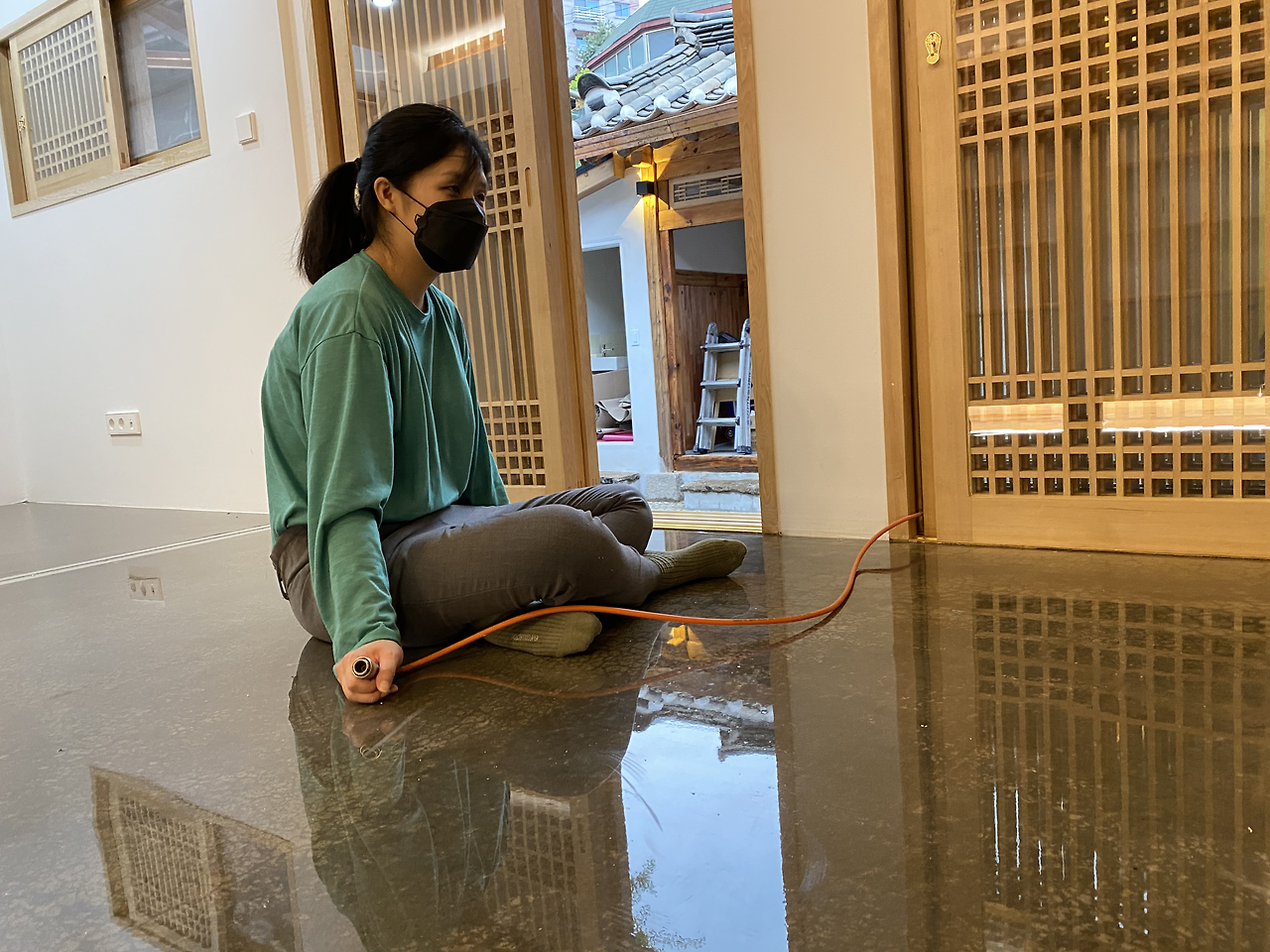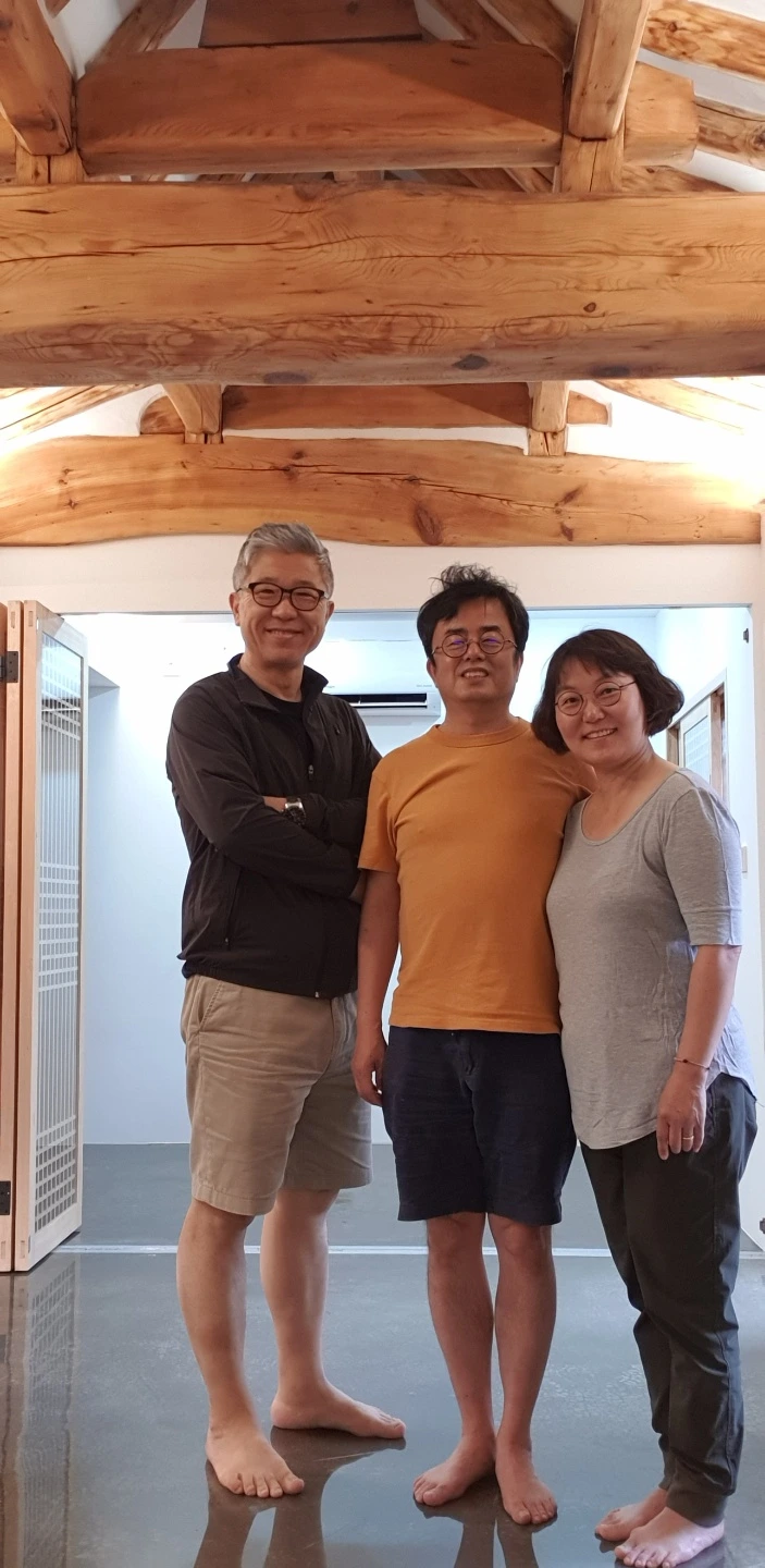 아침 일찍 한옥 수리 현장으로 와 청소를 하다가 배가 고파져 편의점 커피에 빵을 먹으며 청소를 하고 있는데 류왕보 대표님이 두루마리 휴지를 잔뜩 사들고 방문하셨다. 생각해 보면 집수리가 끝나고 우리 집에 온 첫 손님이다. 류 대표는 네모나고 반듯한 마당에 일단 감탄을 한 뒤 안으로 들어와 마루와 작업실, 주방의 바닥 에폭시 마감을 보고는 "겉으로는 전형적인 한옥인데 안으로 들어오니 실내는 남미나 스페인 풍의 이국적인 느낌이 나서 좋습니다."라는 고마운 말씀을 해주셨다. 우리 두 사람의 사진도 여러 장 찍어 카톡으로 전송을 해주셨다.