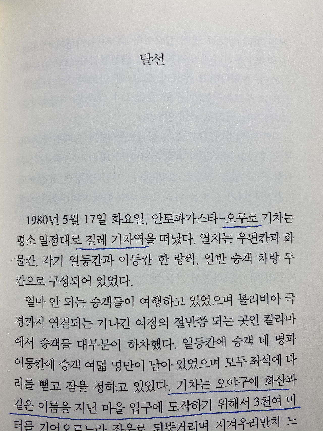 정말이었다. 다들 어쩔 줄 몰라하고 있는데 미용을 배우는 학생이 부끄러운 듯 가방에서 트랜지스터 라디오를 꺼냈다. 오, 좋은 생각이야. 일곱 시니까 뉴스가 나올 시간이야! 뉴스 아나운서는 산페드로 화산 지대 근처에서 일어난 비극적 탈선에 대해 말하고 있었다. 열차는 제동장치 고장으로 철로를 이탈해 절벽 아래로 떨어진 것으로 보이며, 생존자는 없다. 사망자 중엔 유명 권투선수도 있다. 승객들은 묵묵히 서로를 바라보며 그들이 이미 다 죽었음을 깨닫는다.