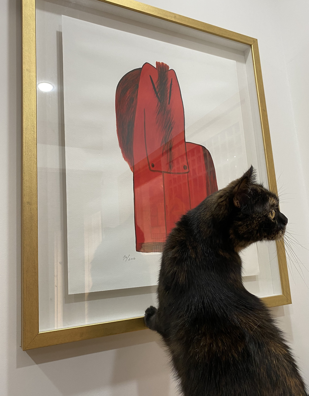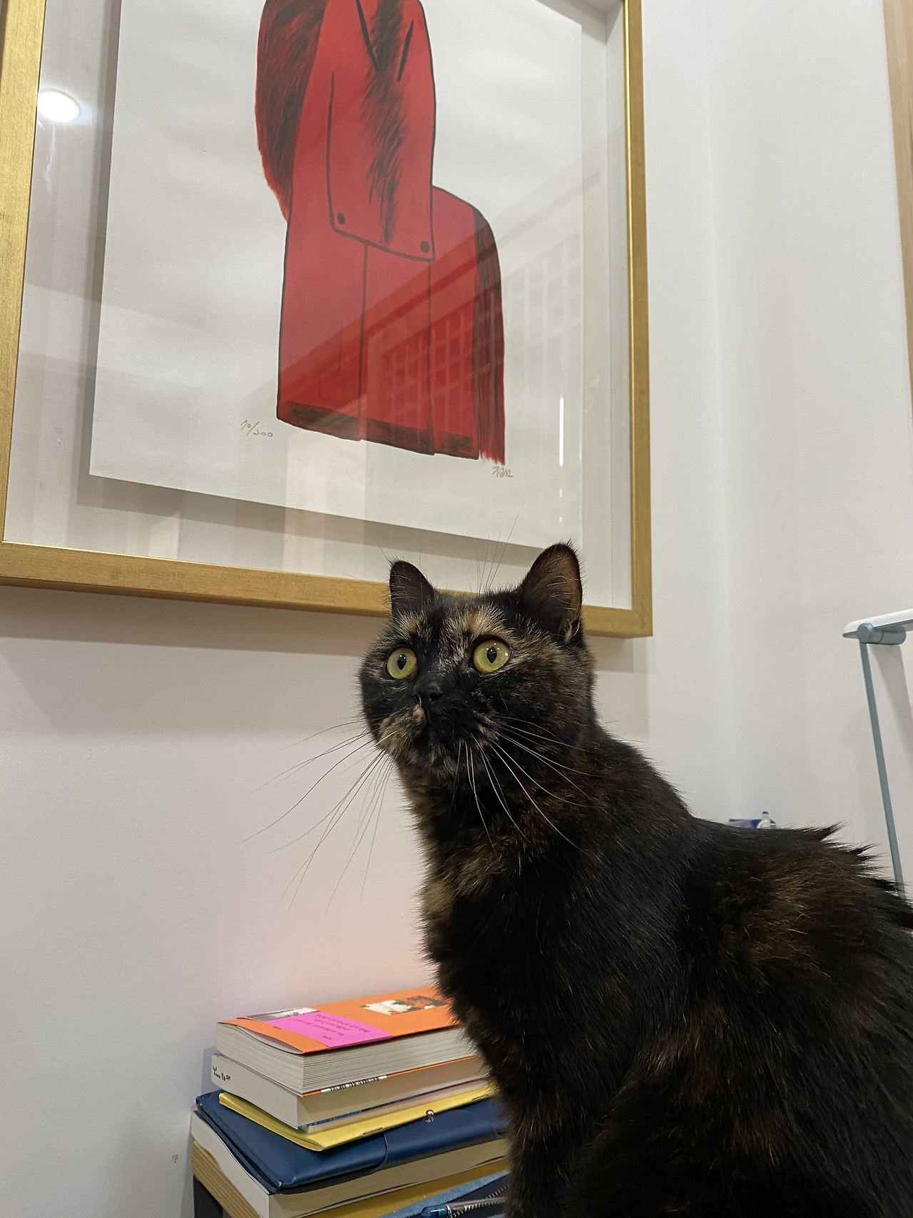 아침 일곱 시, 아저씨가 노트북 키보드를 토닥거리고 있는데 책상 위로 올라와서 ‘나는 김점선의 빨간 말 판화가 마음에 드는데, 너는 어떠냐?’고 물으시는 순자. #네저도마음에듭니다 #좋으니까할부로샀죠 #성북동소행성 #순자 #Soonza #순자는왠지반말을할것같아서