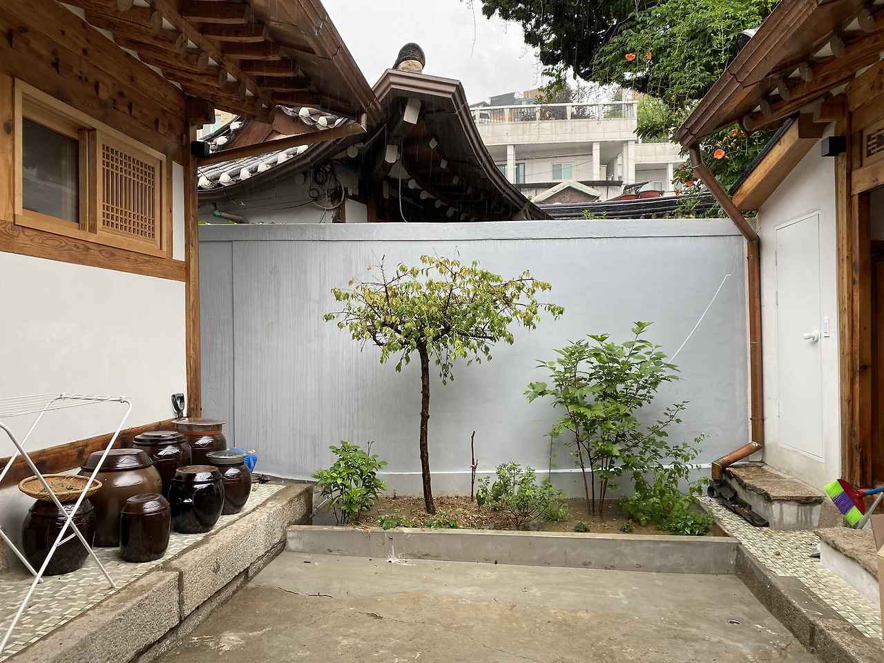 백만 원? 천만 원? 비오는 한옥마당은 값으로 따질 수 없는 고즈녁함이 있습니다. 순자도 아내도 빗소리를 들으며 자고, 지금은 저 혼자 마당 독점 중입니다.