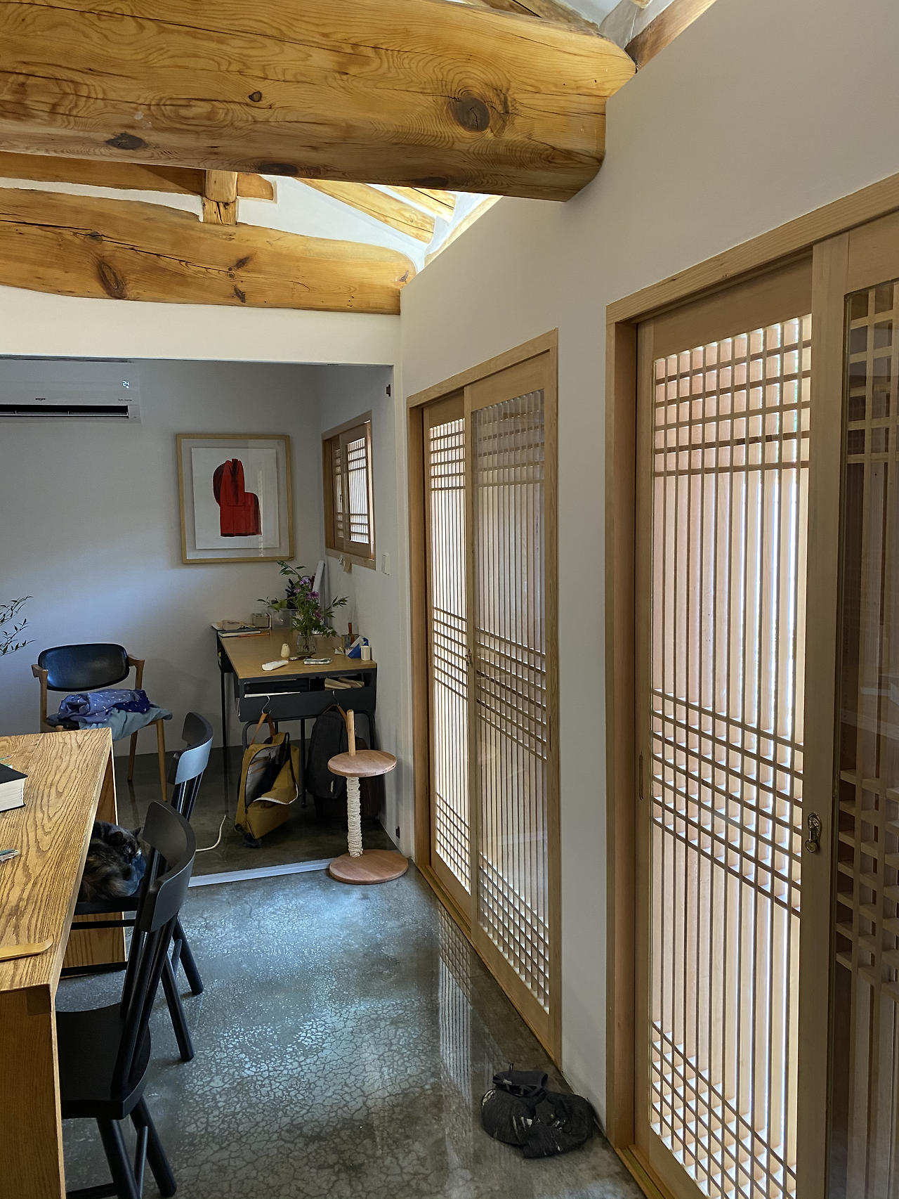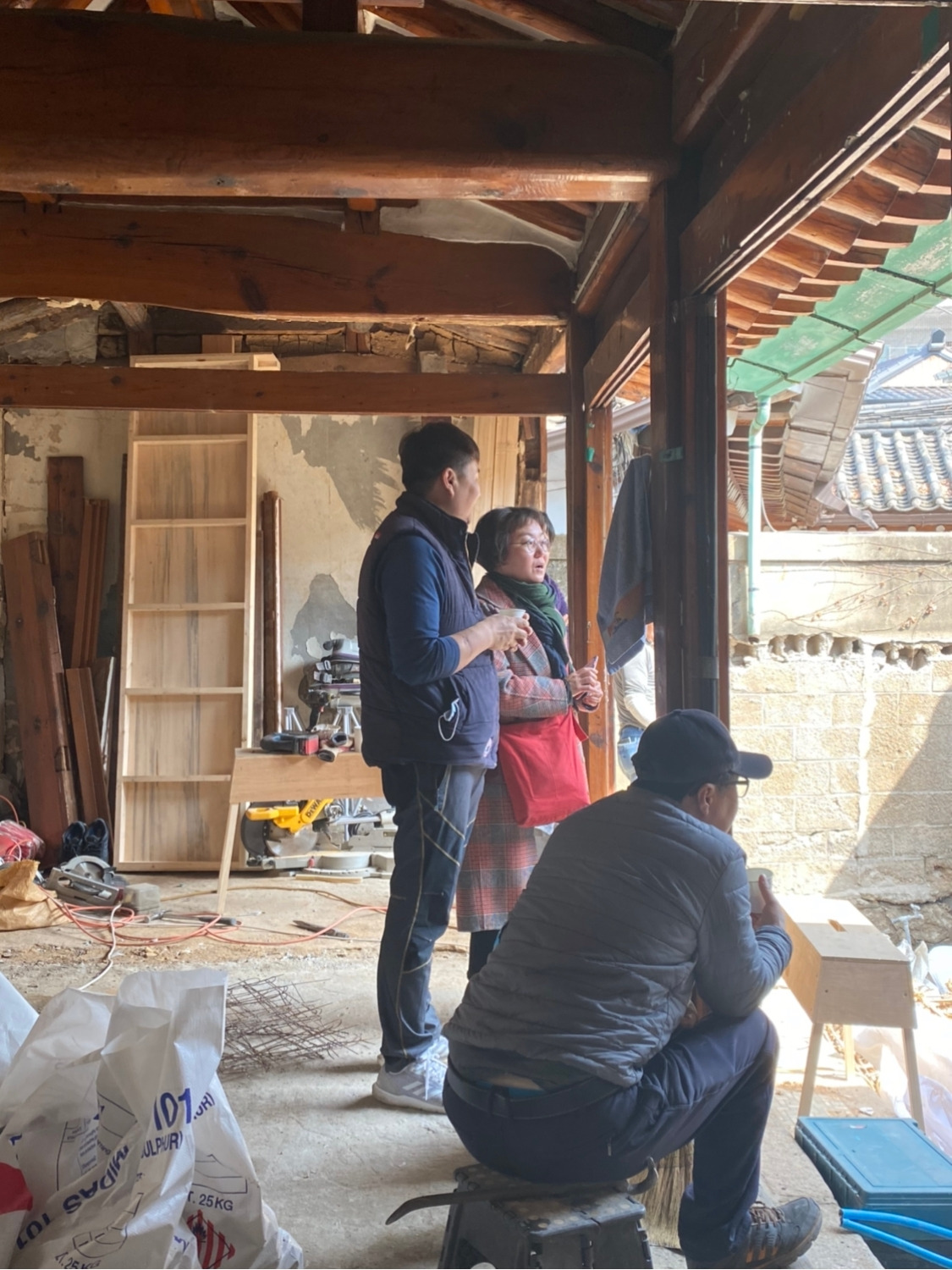 오늘 마루에 앉아 노트북에서 뭘 좀 찾다가 '공사 4일째’라는 폴더가 있길래 들어가 봤더니 벽체를 헐어내고 공사를 할 당시의 심란한 사진이 몇 장 들어 있었다. 임 목수님과 아내가 서 있던 구도에 대들보 위치를 맞춰 다시 한번 사진을 찍어보았다. 불과 몇 달 전 일인데 벌써 아득하게 느껴진다. 에어컨을 켠 채 이 메모를 작성하고 있는데 사진 속의 아내는 겨울 외투를 입고 있어서 그런가 보다.