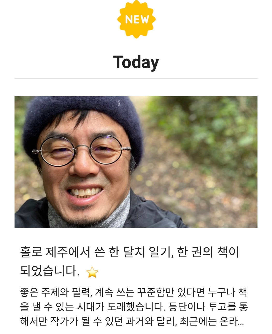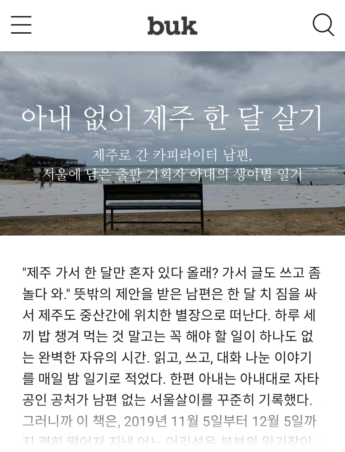 이 책은 제가 30회 분량으로 연재를 마친 짧은글 쓰기 칼럼 『글은 짧게, 여운은 길게』 의 북이오(buk.io) 강민수 대표가 제가 브런치에 쓴 연재 글을 읽어보고 출판을 권하시는 바람에 칼럼집보다 먼저 나오게 된 케이스입니다. 연재를 하는 중간에도 '제주 한 달'이라는 키워드 때문인지 브런치나 다음 메인에도 여러 번 올라갔던 글들이죠.