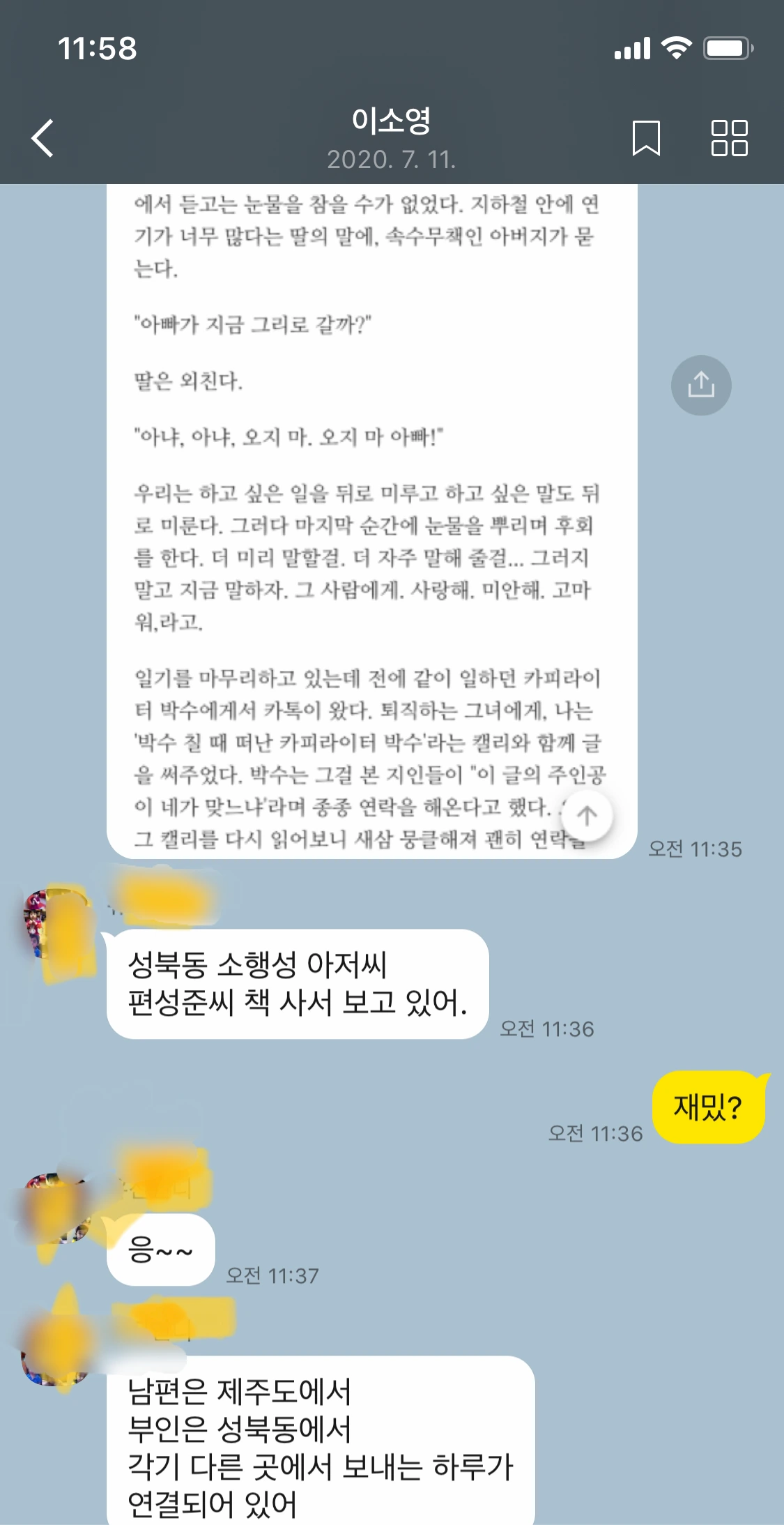 오늘 아침 친한 후배에게서 이런 카톡을 받았습니다. 아는 언니가 제 책 [아내 없이 제주에서 한 달 살기]를 다운 받아 읽고 있는데 재밌다는 소감이었습니다.모르는 분께서 그런 이야기를 해주시니 신이 납니다. 토요일 오후에 이 책 한 번 읽어보세요. 삼천 원짜리 책 한 권이 주말을 흐뭇하게 만들어 드릴지도 모르니까요.