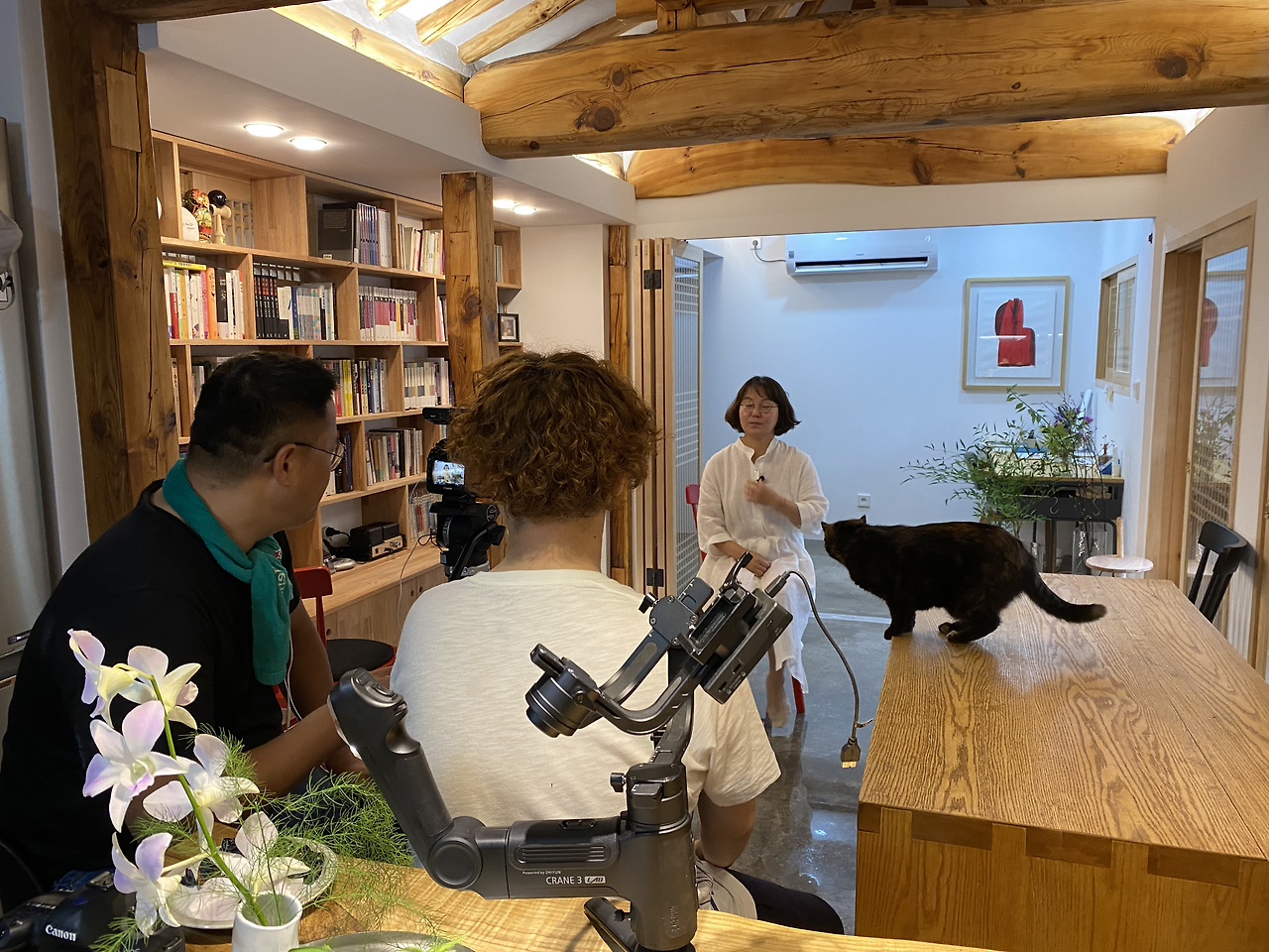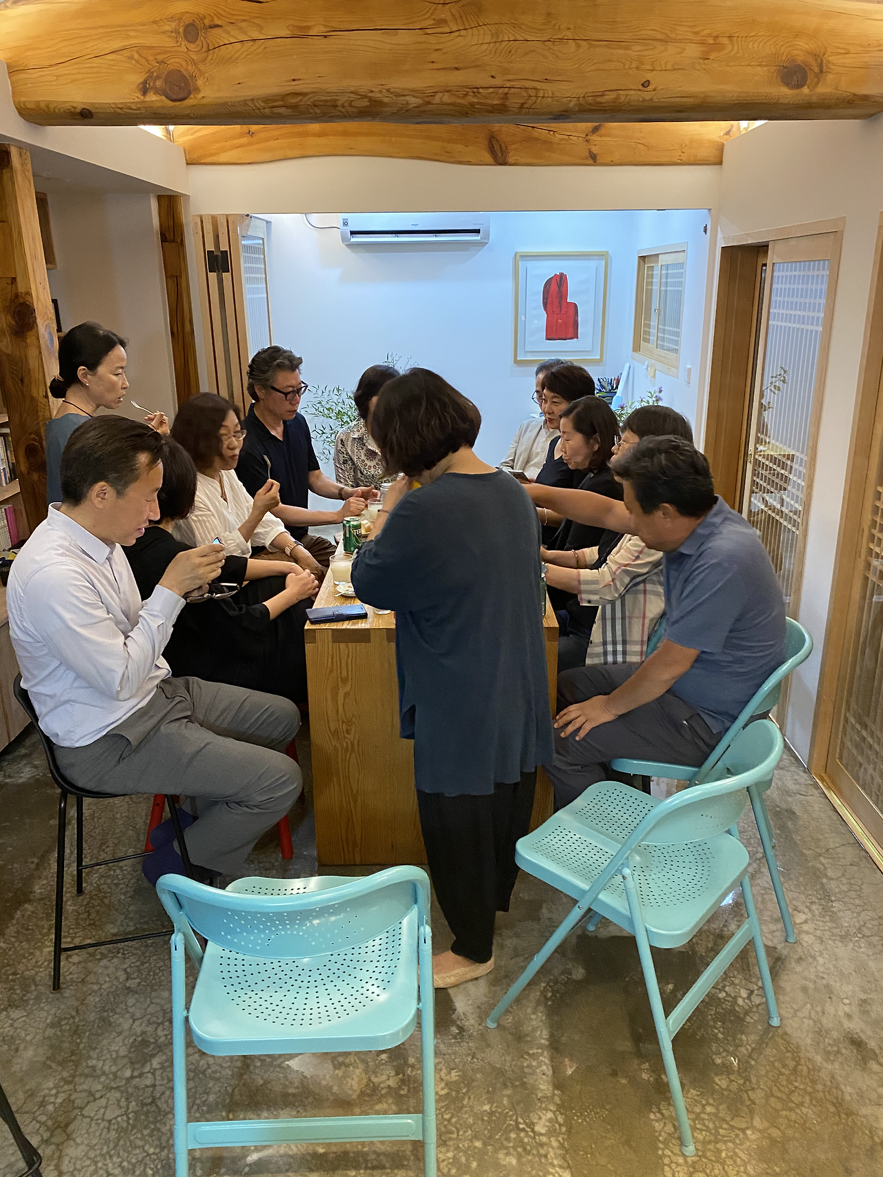아내가 속해 있는 '시인의 마을'이라는 모임 회원들이 놀러 온 적이 있었다. 마침 우리가 한옥을 다룬 '랜선 집들이'라는 아침방송 프로그램 녹화를 하기로 한 날 온다고 해서 날짜를 변경할까 하다가 어차피 이번엔 밖에서 저녁을 먹고 집에서는 간단히 차만 마시기로 했으므로 그대로 강행하기로 했다. 오후 2시에 시작된 한옥 촬영은 저녁 7시가 되어서 끝이 났고 아내는 7시가 되자 먼저 약속 장소인 구포국수로 갔다. 촬영팀이 순자를 귀여워해서 다행이었다. 저녁 겸 술안주로 해물전과 오징어튀김 등을 먹은 시인의 마을 사람들이 집으로 와서 한옥을 칭찬했다. 시인의 마을 사람들은 작가, 교수, 화가, 무용감독, 대기업 임원 등 모두 그 면면이 쟁쟁한 분들이라 어떤 분야의 주제가 등장하더라도 화제가 끊이질 않았다. 맥주를 더 마시는 분도 있었고 막걸리를 마시는 분도 있었다. 처음엔 순자도 테이블 끝에 앉아 손님들의 손길을 받더니 어느 순간 조용해졌고 나중엔 뭔가 이슈가 생겨 서로 목소리를 높이다 보니 거실이 떠나갈 것처럼 소란스러워졌다. 그렇다고 싸우거나 하는 건 아니었고 그냥 다들 열정이 좀 넘치는 분들이었다.
