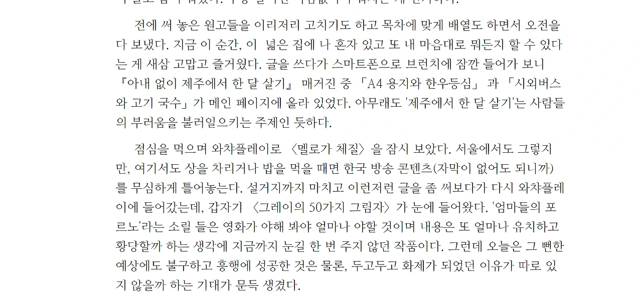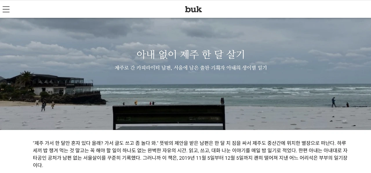 지금 북이오에 들어가셔서 [아내 없이 제주 한 달 살기](https://buk.io/103.0.0.61)라는 전자책을 다운받으십시오. 책값이 삼천 원입니다. 이 책은 제가 작년 11월 한 달간 제주에 있는 별장에 가서 쓴 일기와 아내의 일기를 책으로 엮은 것인데, 책을 구입해 먼저 읽어본 분들은 '꽤 읽을 만하다' '재밌다'라는 일관된 독후감을 전하고 계십니다. 허공으로 금방 날아가 버릴 수도 있는 돈 삼천 원으로 저와 제 아내의 글을 구입해 보십시오. 최소한 하루 정도는 상쾌하고 흐뭇한 기분으로 지내실 수 있다고, 이 연사...... 아니 이 저자, 힘차게 외칩니다.