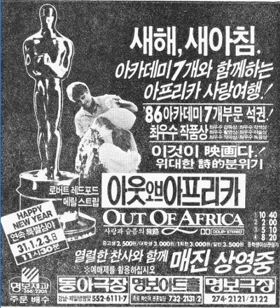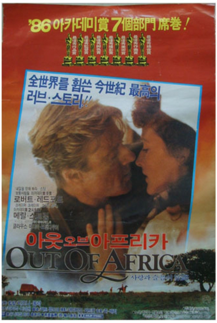 너무 오래 전의 기억을 더듬느라 며칠을 보냈다. 이 영화를 볼 때 우리는 각자 어떤 꿈을 꾸고 있었을까. 그 겨울 '아웃 오브 아프리카' 전단지를 나눠주며 곱은 손을 호호 불던 우리들은 몇 년 후 졸업을 하고 사회로 나갔다. 서양화과에 다녔던 재덕이 형은 광고회사에 들어가 오디오 PD가 되었고 기계과에 다녔던 규석이 형은 컴퓨터 관련 회사에 들어갔다. 목공예과를 졸업한 진희 누나는 장난감 회사에 취직을 했고 나도 광고대행사에 다니던 선배들의 영향을 받았던 탓에 결국 카피라이터가 되었다. 한동안 이 영화를 잊고 지내다가 며칠 전 페이스북 친구 중 한 분이 이 영화를 다시 보았다는 글을 올렸길래 나도 찾아보게 된 것이었다. 영화의 기억은 아련하지만 덕분에 스무 살 시절의 나를 만날 수 있었기에 고마운 영화다. 아프리카로부터는 항상 무언가 새로운 것이 생겨 난다는 뜻의 아웃 오브 아프리카. 잊지 말아야겠다. 영화 제목의 의미도, 또 내가 이 영화 덕분에 거리에서 전단 나눠주는 사람들에게 어느 정도 '측은지심'을 가질 수 있는 사람이 되었다는 사실도.