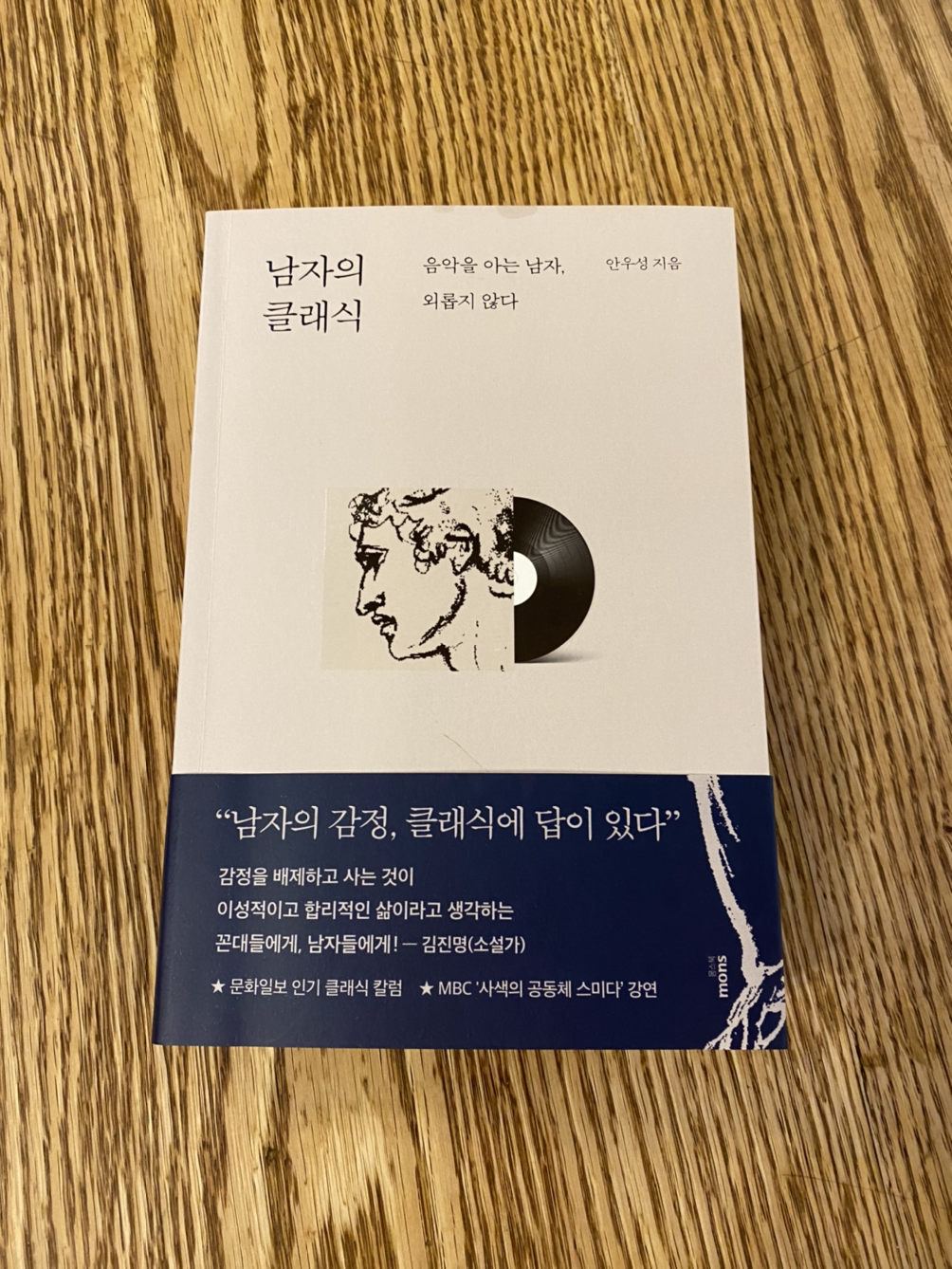 '남자의 클래식'이라는 책 제목이 나온 배경 설명인 듯하다. 그러나 책을 다 읽어보면 이는 남자에 국한된 얘기만은 아니라는 것을 알 수 있다. 다만 남자들이 여자들에 비해 상대적으로 감정을 드러내고 찾는 일에 익숙하지 못하기에 이런 제목이 나오게 된 것이다. 이 책의 부제는 '음악을 아는 남자, 외롭지 않다'이고 표지에 두른 띠지의 헤드라인은 "남자의 감정, 클래식에 답이 있다"인데 이건 내가 쓴 카피다. 책이 출판되기 직전에 우연히 출판사에 놀러 갔다가 안지선 대표님의 고민을 듣고 몇 개 써 본 카피 중 하나가 채택된 것이었다. 좋은 책이 독자들에게 가는 데 조금이라도 도움이 된 것 같아 기뻤다.