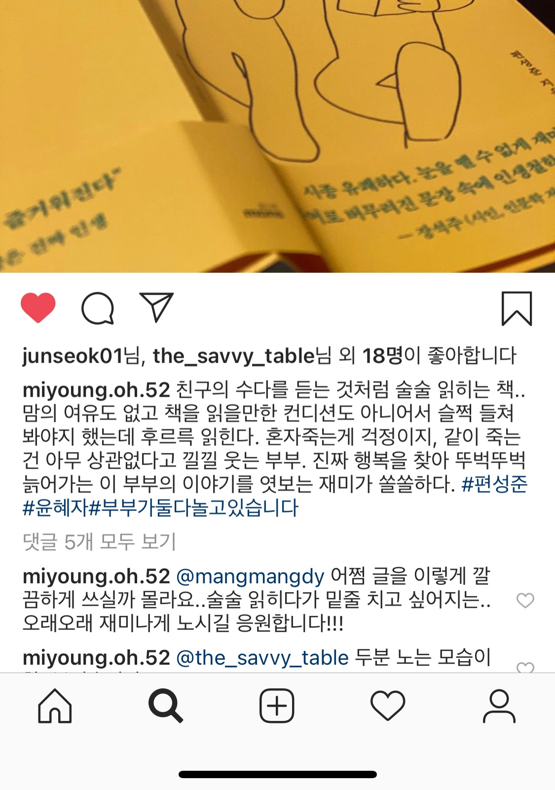 오미영 작가가 써 준 리뷰도 따뜻하다. 같이 타고 가다가 사고가 날까 봐 운전을 안 하고 살았다는 나의 어설픈 변명에 “혼자 죽는 게 걱정이지 둘이 함께 죽는 건 아무 문제없다”라고 한 아내의 대답이 인상 깊으셨나 보다.