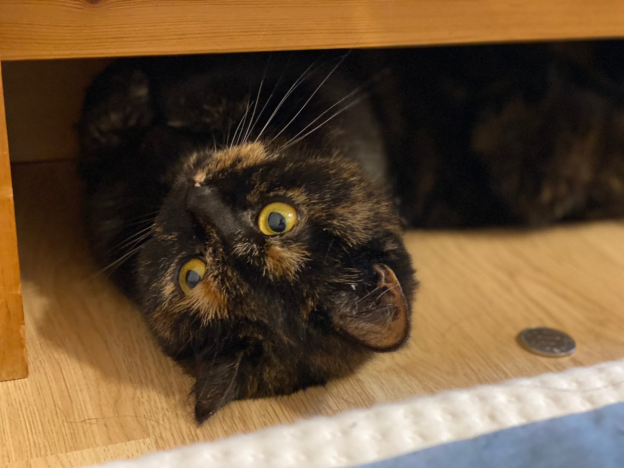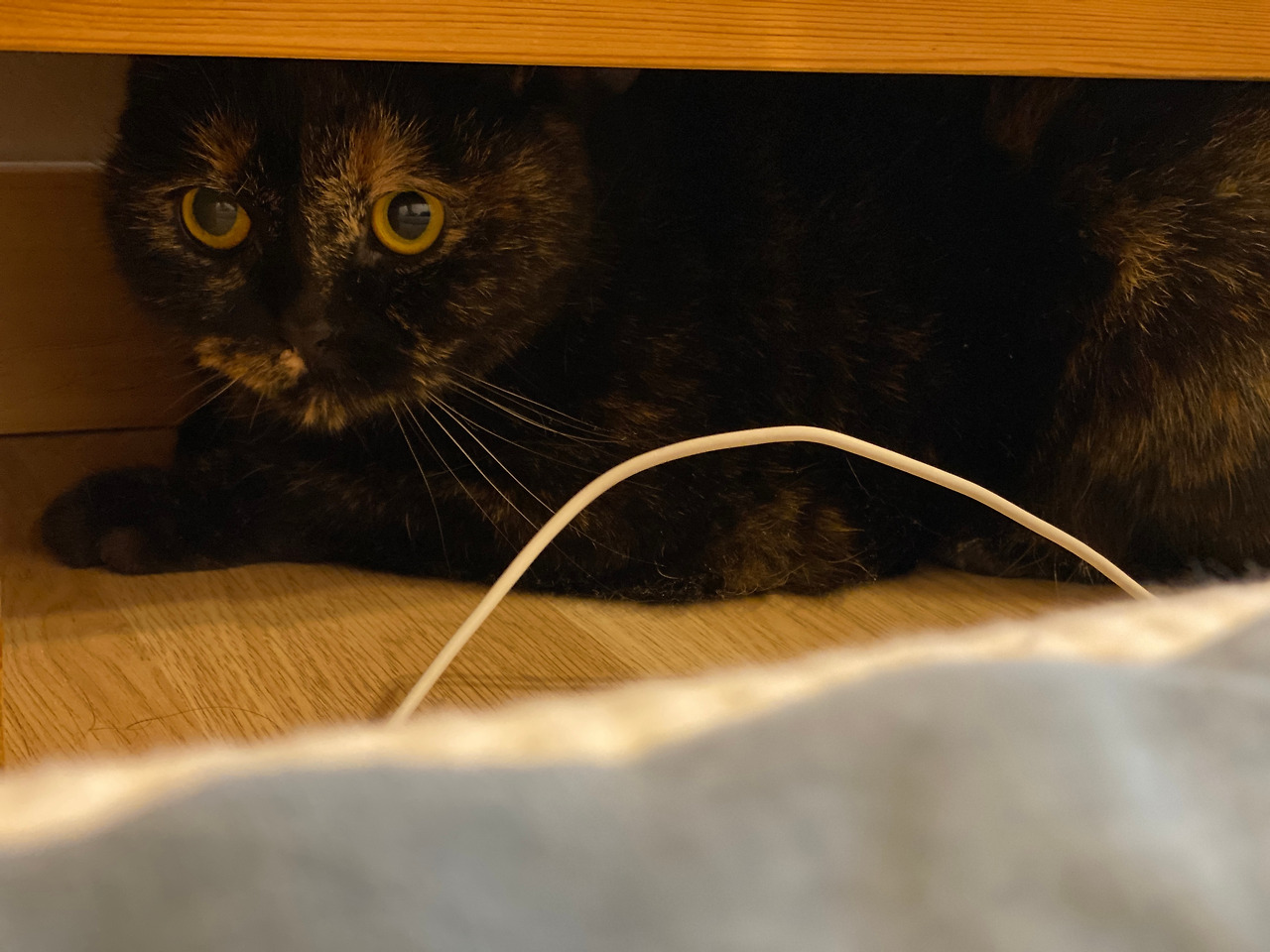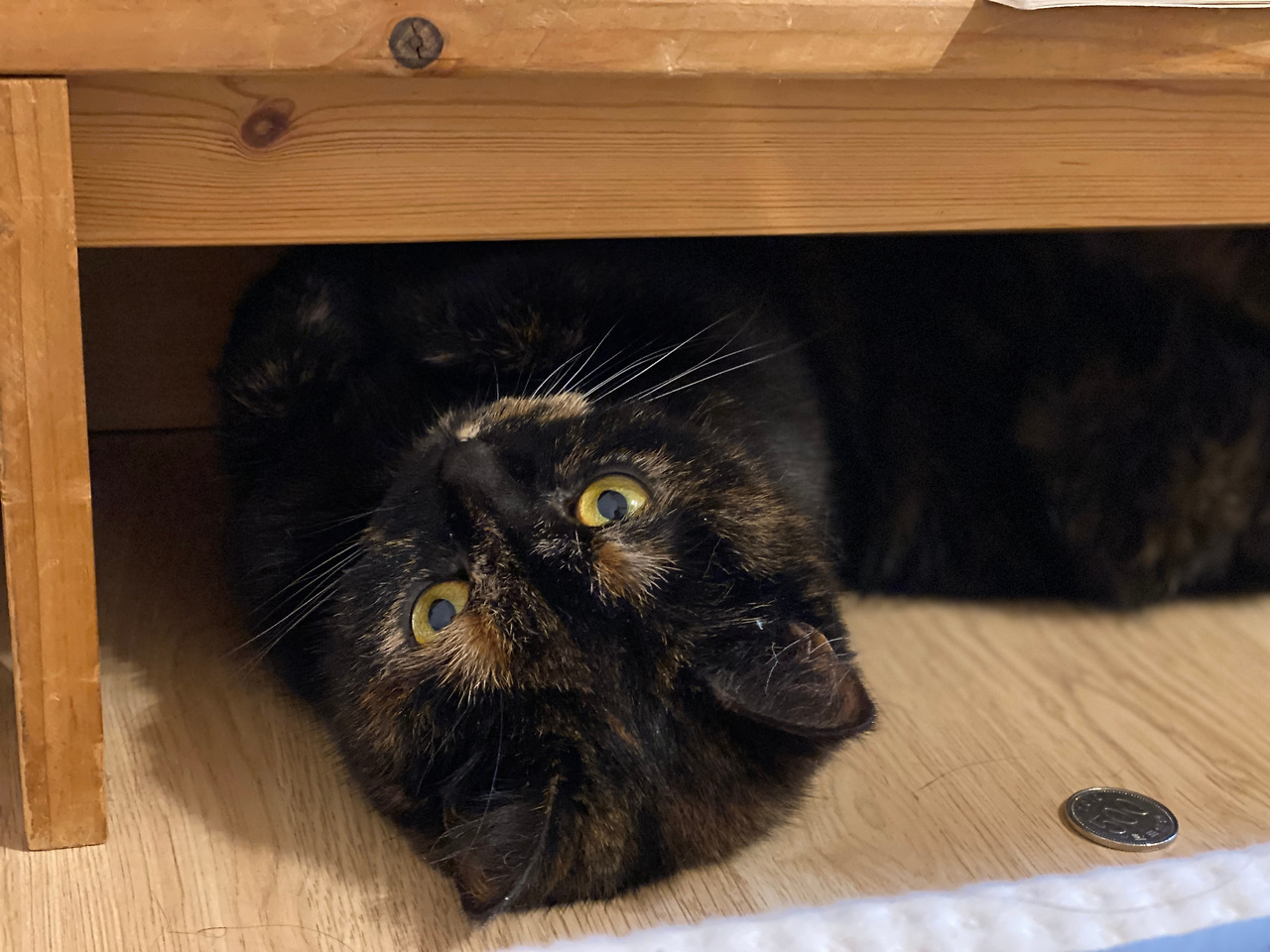 일요일 아침에 일찍 눈이 떠지는 바람에 마루에 나가 뭔가 짧은 글도 쓰고 책도 읽고 하다가 다시 안방으로 와 자리에 누웠더니 순자가 다가와 애앵 울며 놀자고 한다. 뭐야, 하고 밀어내니 머리맡에 있는 탁자 밑 좁은 공간으로 들어간다. 저길 들어가네, 하고 내가 스마트폰을 꺼내 사진을 찍는다. 순자가 그런 나를 빤히 쳐다본다.