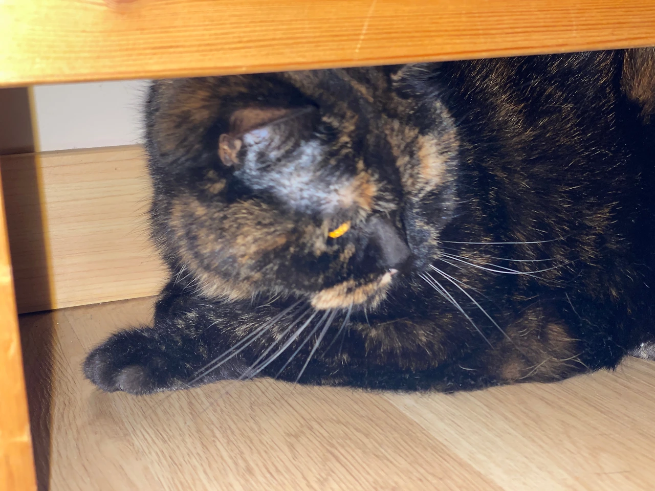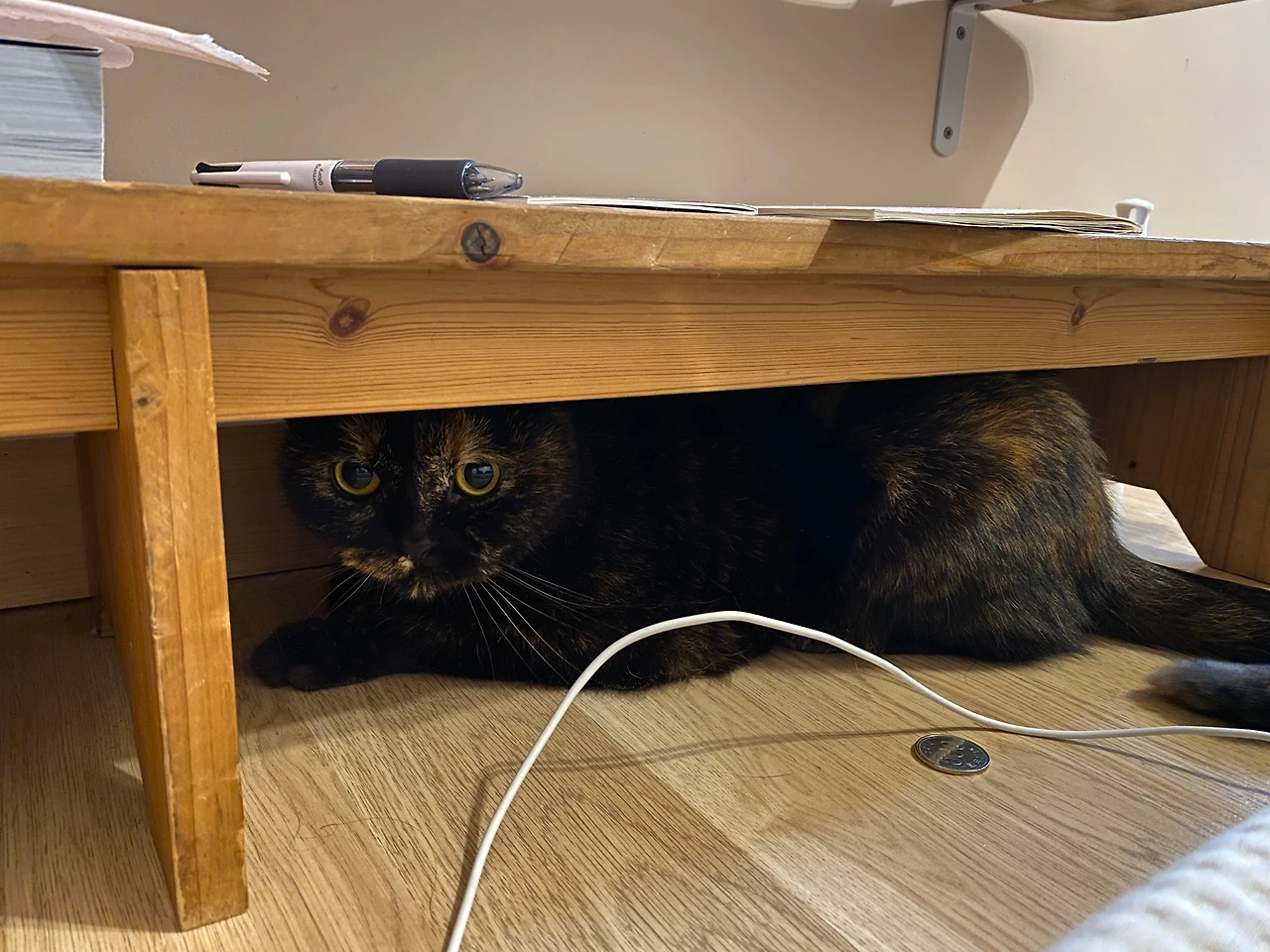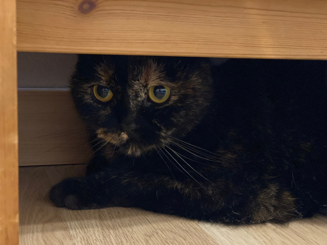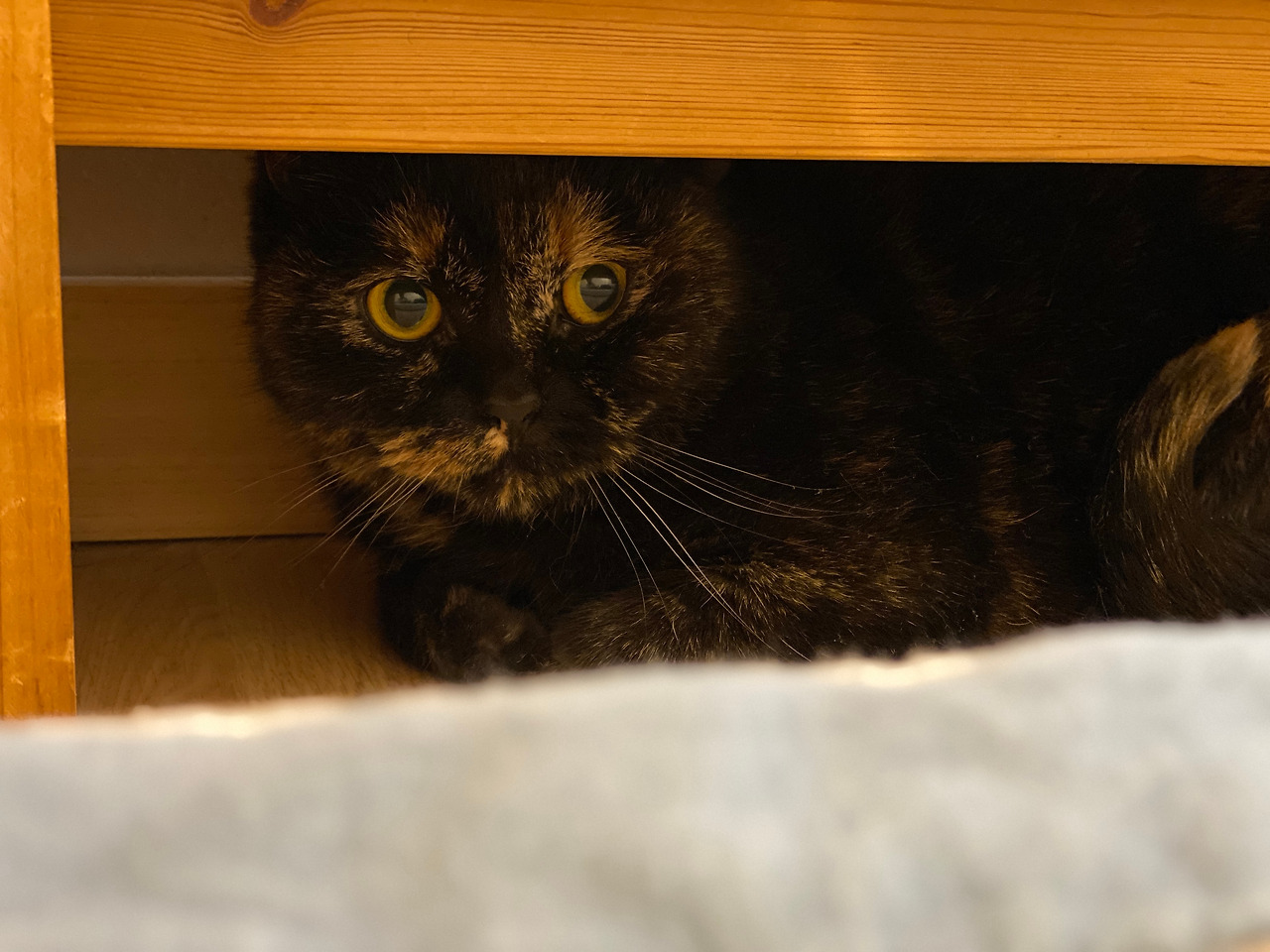 일요일 아침에 일찍 눈이 떠지는 바람에 마루에 나가 뭔가 짧은 글도 쓰고 책도 읽고 하다가 다시 안방으로 와 자리에 누웠더니 순자가 다가와 애앵 울며 놀자고 한다. 뭐야, 하고 밀어내니 머리맡에 있는 탁자 밑 좁은 공간으로 들어간다. 저길 들어가네, 하고 내가 스마트폰을 꺼내 사진을 찍는다. 순자가 그런 나를 빤히 쳐다본다.