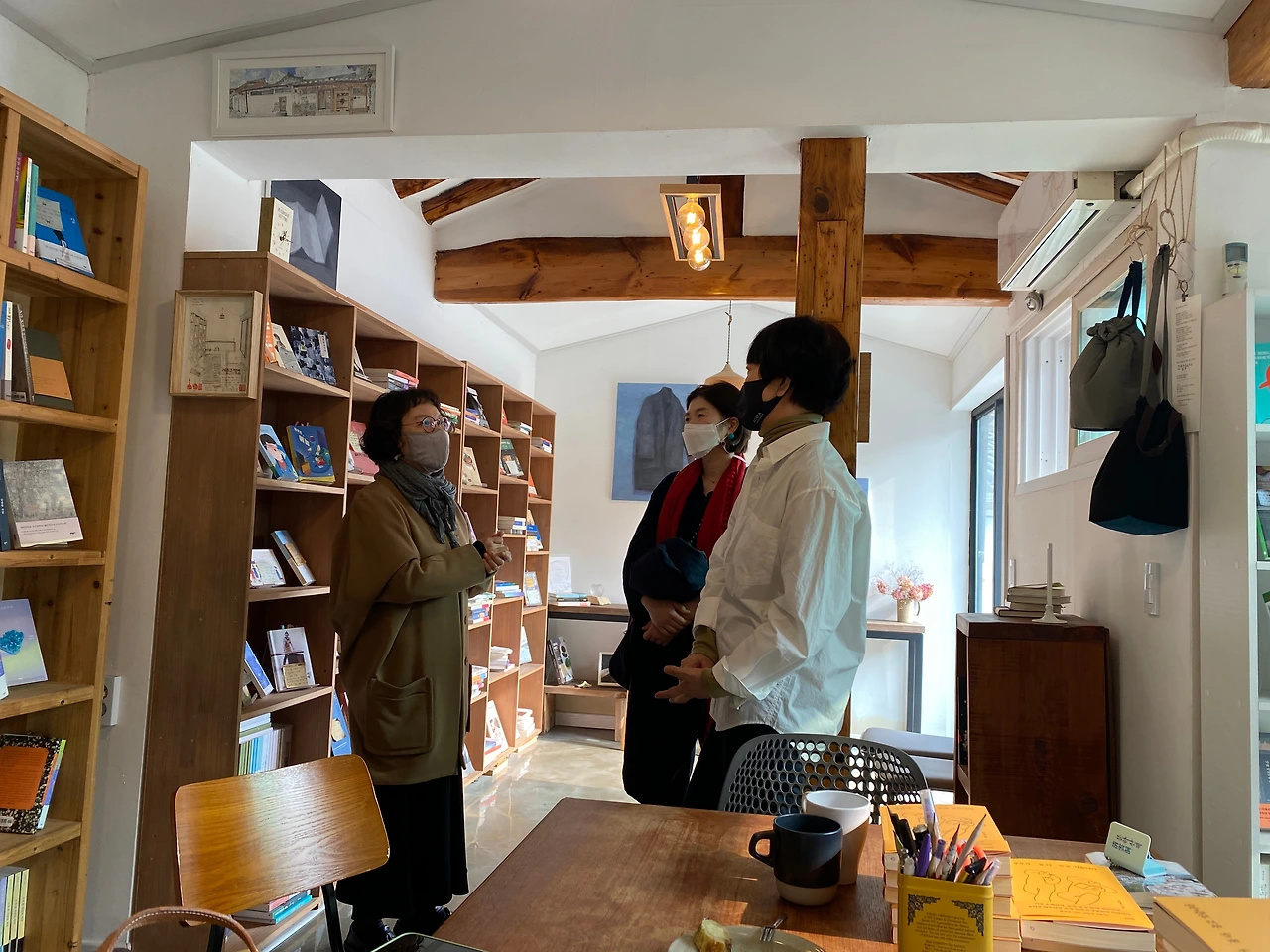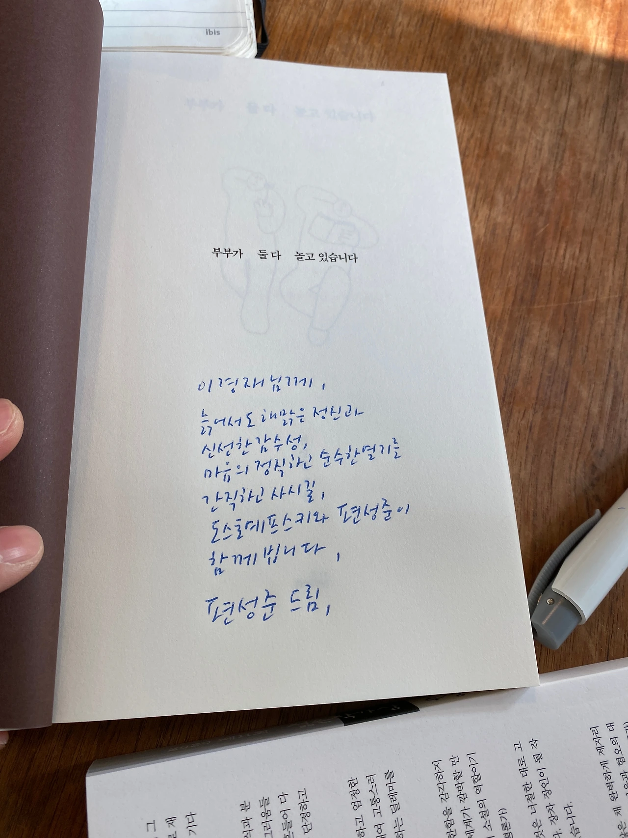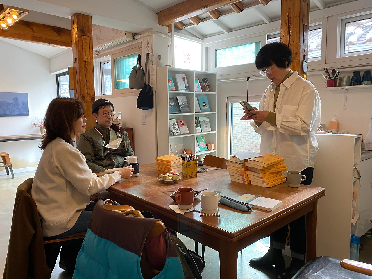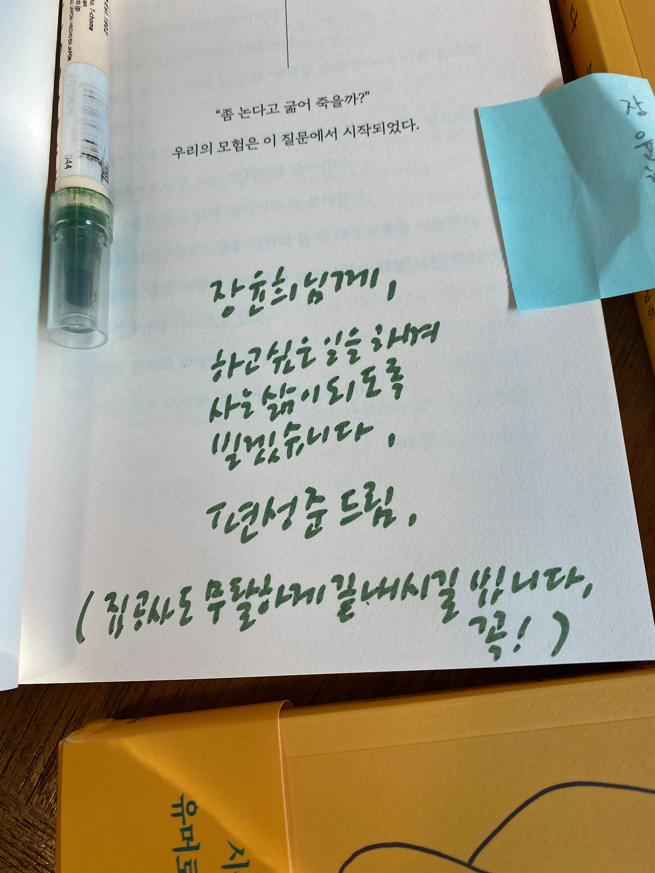포스트잇에 적힌 예비 독자들의 이름과 짤막한 메시지를 쓰고 제 이름을 써넣었습니다. 사장님이 커피와 오븐에 구운 고구마를 내주셔서 그걸 먹으며 싸인을 하고 있는데 독서클럽 회원 몇 분이 마침 오셔서 같이 이야기도 나누고 싸인도 해드렸습니다. 사장님이 즐겨 쓰시는 초록색 캘리펜을 주셔서 그걸 사용했는데 이경재 님 같은 경우엔 자신이 평소 좋아하던 도스토예프스키의 글귀를 같이 써달라 하셔서 제가 쓰던 파란색 볼펜으로 써드렸습니다. 저희 부부처럼 서촌에 있는 한옥을 사서 고치고 계시는 장윤희 님과도 만나 이야기를 나누었습니다. 장윤희 님은 이미 저희가 브런치에 연재했던 한옥 수리과정을 읽으셨다고 하더군요. 모두 반가운 얼굴이었습니다.