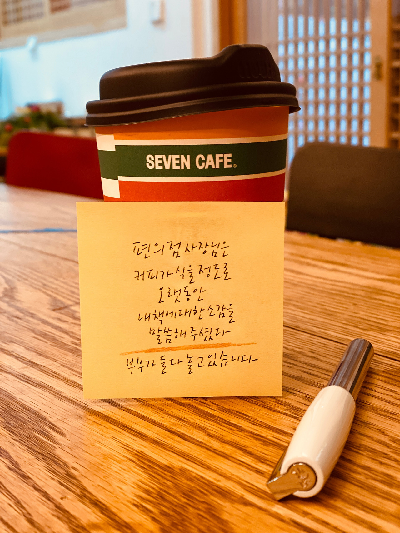 일요일 아침. 일찍 일어나 샤워를 하고 책을 읽기 전 커피를 한 잔 사려고 집 앞 편의점에 갔더니 사장님이 반갑게 인사를 하며 책을 잘 읽고 있다는 말씀을 하셨다. 그제 밤에 술안주 사러 가는 길에 내 책 [부부가 둘 다 놀고 있습니다] 사인본을 선물로 드렸더니 그 인사를 하시는 것이었다. 책이 나오고 나서 친구나 주변 사람들에겐 한 권도 그냥 주지 않고 직접 사서 읽어달라 부탁을 했지만 우리 동네 정든부동산 사장님과 세븐일레븐 성북문화점 사장님께는 책을 선물로 드렸다.