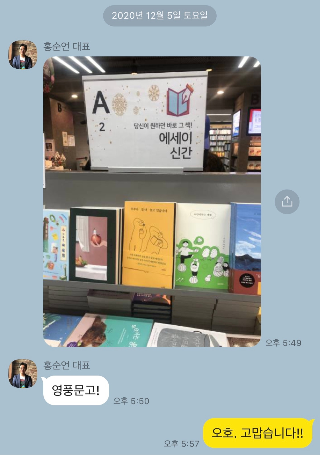 생각보다 많은 분들이 책을 좋아해 주시는 바람에 출간 한 달여 만에 4쇄를 찍게 되었으니 예전 같으면 동네서점으로 지방으로 북토크를 한창 하고 다닐 타이밍인데 요즘 코로나 19 감염자 수가 급격히 늘어나는 바람에 미리 잡아 놓았던 행사들까지 모두 연기가 되고 말았습니다. 코로나 19의 기세가 좀 꺾이면 다시 북토크를 하러 다니고 싶지만 지금은 서로 안 만나고 안 모이는 게 상책이라고 생각합니다(저희 집에서 열리는 독서모임 '독하다 토요일'도 다음 주 토요일 오후 3시에 각자의 집에서 줌을 통해 만나기로 했습니다). 친구와 전화를 끊고 나니 홍보대행사 '애그피알'의 홍순언 대표가 영풍문고 매대에 올라가 있는 제 책 사진을 찍어 보내주셨습니다. '당신이 원하던 바로 그 책! 에세이 신간'이라 쓰여 있는 곳 정가운데에 제 책이 있는 걸 보고 반가운 마음에 보내준 모양입니다. 어쩌면 이렇게 사진과 뉴스를 주고받는 것도 일종의 '북토크'가 아닐까 생각합니다. 그리고 정말 고마운 일이죠. 제가 인복을 좀 타고났다는 건 이미 느끼고 있었지만 요즘은 정말 그 인복의 위력을 실감하고 있는 중입니다. 부탁하지도 않았는데 자발적으로 리뷰를 써주고 이미 읽은 책을 여러 권 사서 주변 사람들에게 선물한다는 게 어디 말처럼 쉬운 일이던가요.