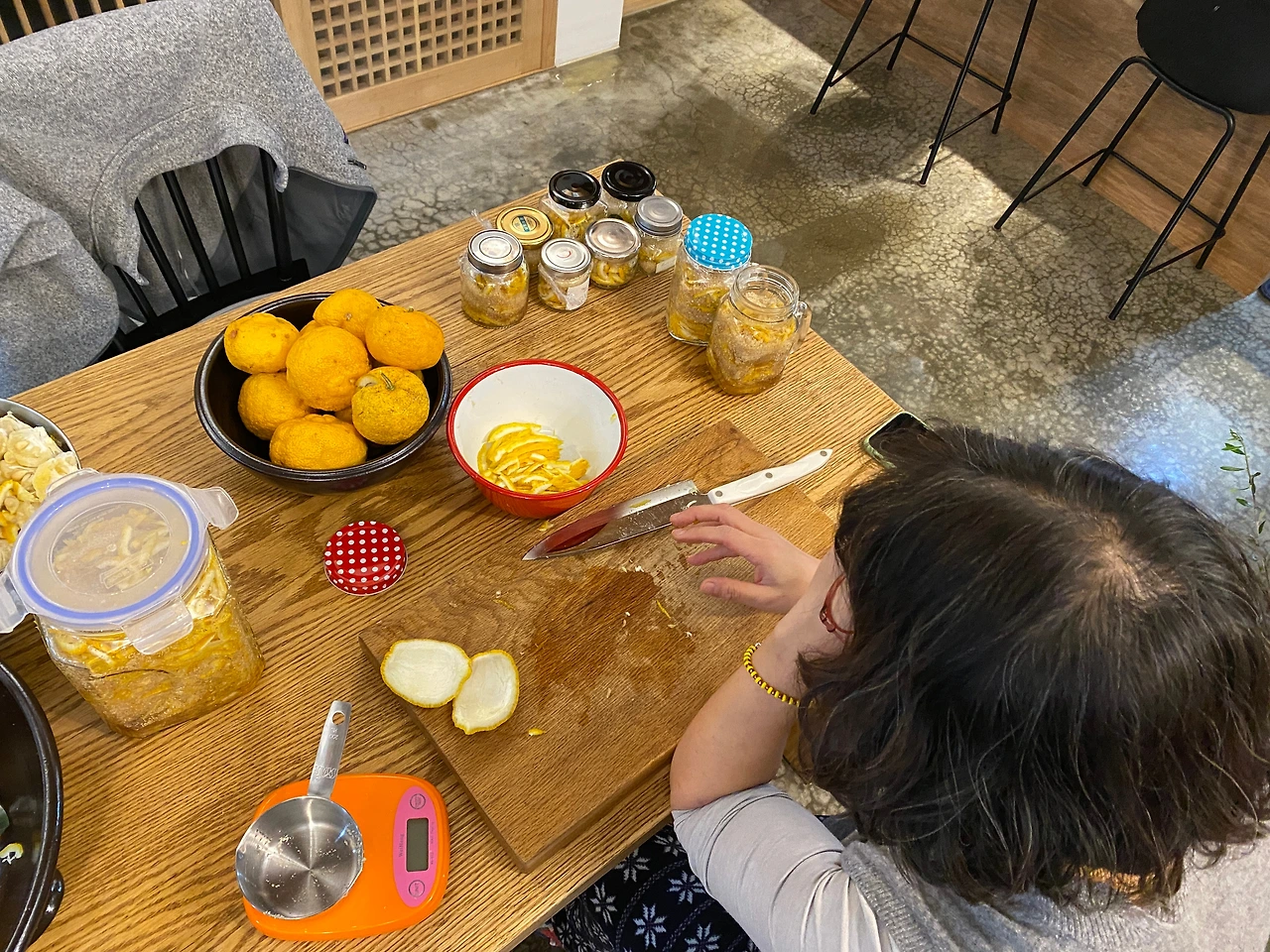 여기까지 쓰고 있는데 아내가 크게 한숨을 내쉬길래 쳐다보니 유자청을 만드느라 유자 열매를 썰다가 너무 힘이 들어서 그런 것이었습니다. 아내는 아침부터 잠시도 쉬지 않고 일을 하고 있습니다. 저는 달려가서 "여보, 나는 당신이 일 하다가 쓰러지는 건 보고 싶지 않아."라고 말했지만 아내는 칼질을 멈추지 않습니다. 도대체 왜 이러는 걸까요. 좀 쉬었다 하라고 해도, 잠깐 쉬면서 TV라도 좀 보라고 해도 전혀 말을 듣지 않습니다. TV는 너무 재미가 없어서 안 보겠답니다. 그리고 썰던 유자청을 마저 썰어야 한답니다. 아내를 뜯어말리고 일 대신 '북토크'를 하고 싶습니다. 물론 아내는 콧방귀 뀌며 유자청을 택하겠지만 말입니다. 북토크가 유자청과 싸우게 될 줄은 정말 몰랐습니다.