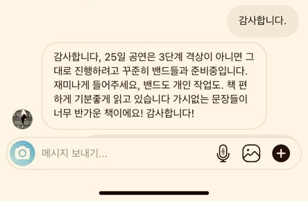 아내가 워낙 <아마도이자람밴드>의 열성팬이라 제 책을 보내드렸더니 오늘 이자람 뮤지션이 직접 메시지를 보내왔다고 하네요. 코로나 19 때문에 크리스마스 공연이 어떻게 될지 아직 모르는 상황에서도 책을 잘 읽고 있다는 소감을 전해 왔습니다. '가시 없는 문장들이 너무 반가운 책'이라는 표현에 우쭐해져서 저도 이렇게 자랑을 해봅니다.