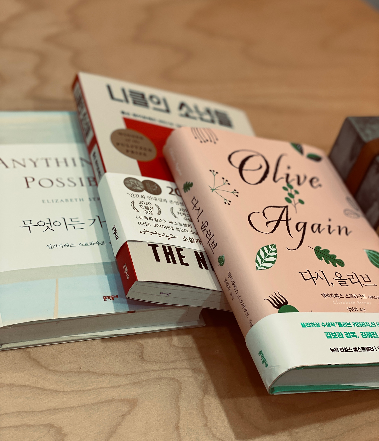 주택가 골목에 자리 잡은 니은서점은 짙은 녹색 간판과 벽이 예쁜 서점인데 안으로 들어가니 오밀조밀한 책 배열과 인테리어도 좋다. 이곳은 사회과학과 인문학 서적이 메인이지만 소설 등 다른 분야의 책도 있으므로 우라는 가운데 있는 매대부터 훑어가기 시작했다. 아내가 '어차피 살 책이라면 이 책방에서 사라'면서 [다시, 올리브]를 가리켰다. 내가 어제부터 집에 있던 엘리지베스 스트라우트의 [무엇이든 가능하다]를 읽기 시작했다는 것을 알고 하는 권유다. [다시, 올리브]를 챙긴 나는 노 대표의 책 중 베버의 책을 쉽게 풀어쓴 [프로테스탄트 윤리와 자본주의 정신, 노동의 이유를 묻다]가 재밌을 것 같았으나 다른 읽을 책들이 밀려 있어서 당장은 힘들 것 같았고 대신 [호모 루덴스, 놀이하는 인간을 꿈꾸다]를 들었다 놨다 했다. 아내는 천천히 책을 둘러보다가 노명우 대표에게 자신의 이름을 얘기하며 "페이스북에서 가끔 인사를 드리긴 하는데, 아마 잘 모르실 거예요."라고 하길래 나도 "안녕하세요? 저는 편성준이라고 합니다."라고 얹혀서 인사를 드렸다. 노 대표는 요즘은 다들 마스크를 써서 얼굴을 알아보기 힘든데 그래도 자세히 보니 윤곽이 기억에 남아 있다고 하며 우리의 인사를 받아주었다.