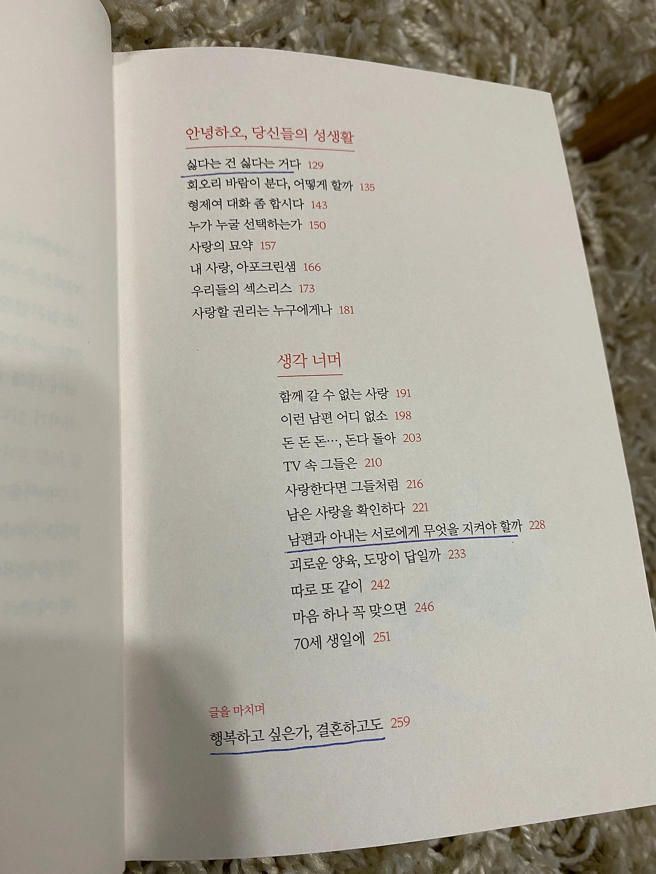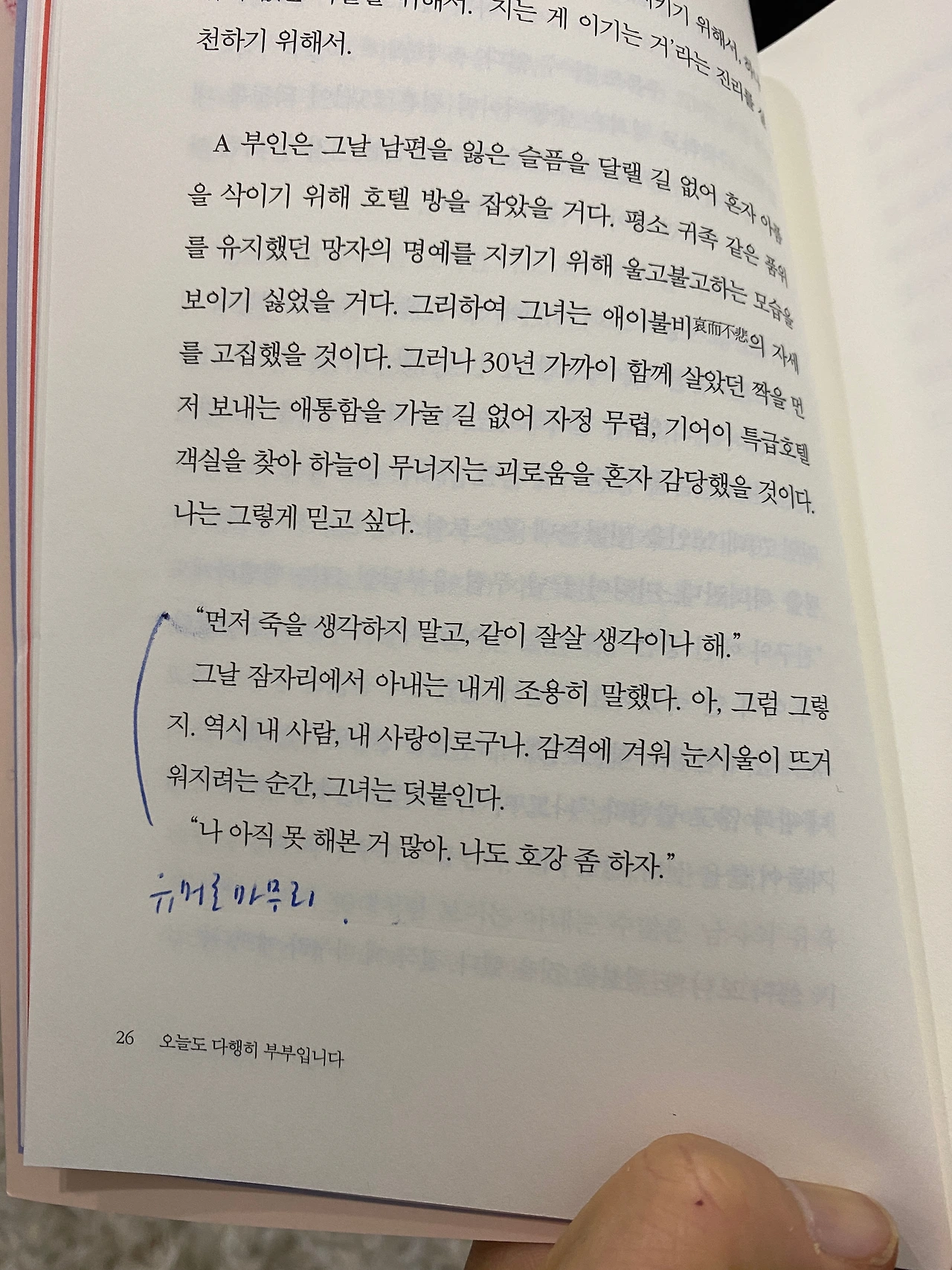 명로진은 말한다. 부모나 자식보다 중요한 게 동반자이고 동반자보다 중요한 게 나 자신이다. 프랑스 작가 앙드레 모루아는 "부부란 둘 중에 낮은 수준의 사람에 맞춰 살게 마련이다'"라고 했단다. 나 스스로 인격자로 우뚝 서야 모두의 삶이 제대로 돌아간다는 뜻이리라. 여기까지 읽고 나니 이건 부부 이야기를 살펴보려고 책을 펼쳐 들었는데 인생의 진리까지 보너스로 받은 격이다. '세상은 제스처다' '액션의 완성은 리액션' '폭력이라 이름 붙이지 않은 폭력' '싫다는 건 싫다는 거다' '돈 돈 돈..., 돈다 돌아' 등등 목차에 나온 소제목만 보아도 이 책의 진가를 알 수 있는데 정작 명로진은 자신이 행복해지고 싶다는 '이기적인 이유'로 이 책을 썼다고 한다. 그는 인생의 고민들도 글로 써보면 해결점이 보인다는 것을 이미 아는 사람인 것이다. 하긴 그러니 그동안 오십 권이 넘는 책을 썼겠지 싶다(이 책은 그의 생애 52번째 단행본).