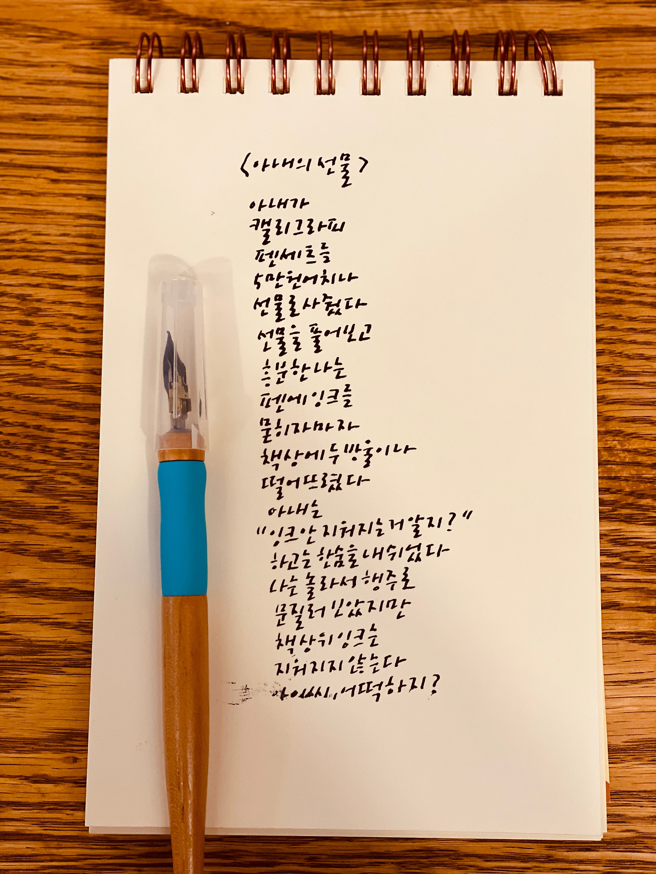 <아내의 선물> 아내가 캘리그라피 펜 세트를 5만 원어치나 선물로 사줬다. 선물을 풀어보고 흥분한 나는 펜에 잉크를 묻히자마자 책상에 두 방울이나 떨어뜨렸다. 아내는 "잉크 안 지워지는 거 알지?" 하고는 한숨을 내쉬었다. 나는 놀라서 행주로 문질러 보았지만 책상 위 잉크는 지워지지 않는다. 아이씨, 어떡하지?